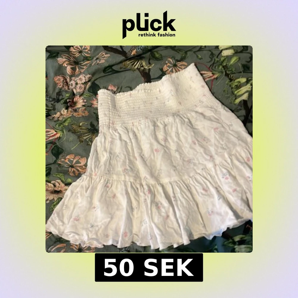Söt vit kjol med blommigt mönster i pastellfärger. Kjolen har en volangdetalj och en elastisk midja för en bekväm passform. Perfekt för varma dagar! Orginal pris 150 men säljer för 50