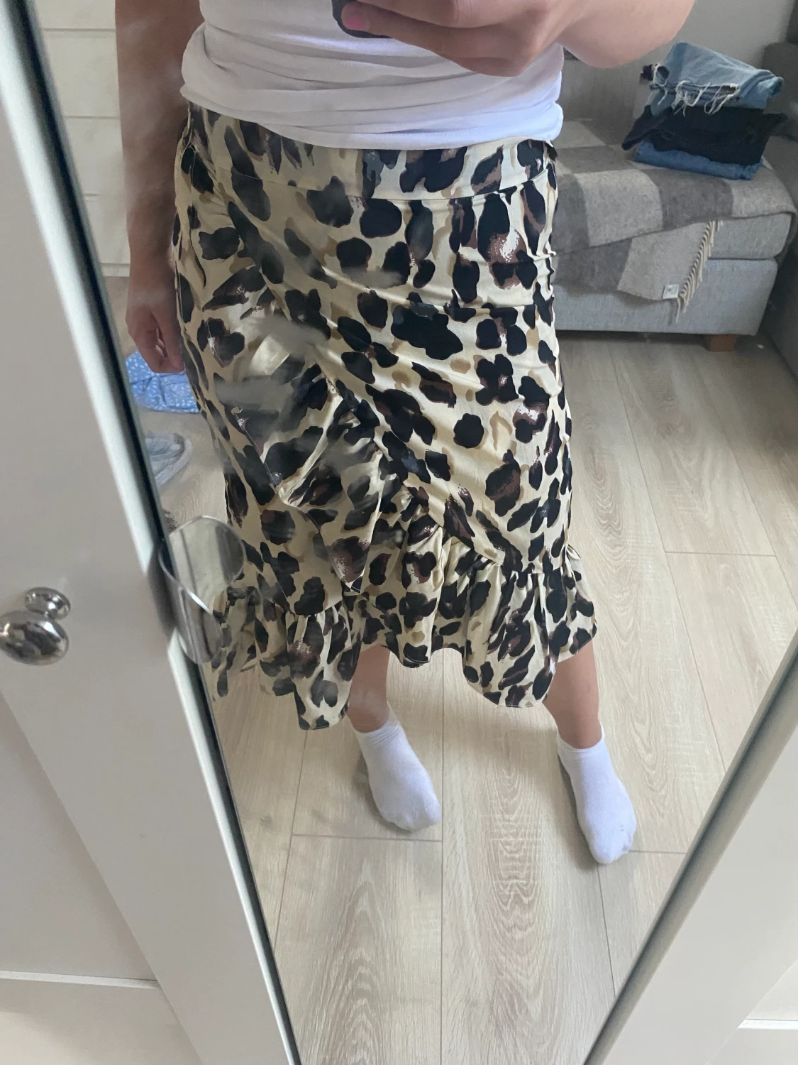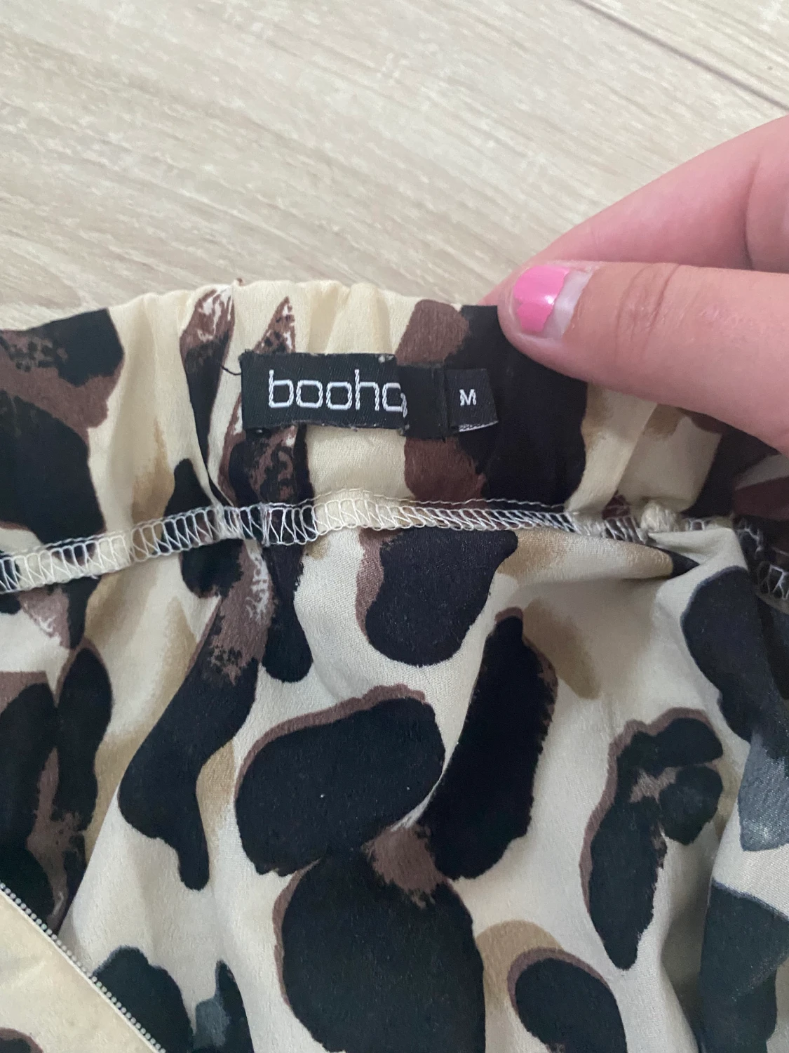 leopard mönstrad midikjol från boohoo i storlek M! köptes sommaren 2020 men har inte används på typ 2 år. den har en liten defekt, ett jack i midjan (se bild 3) men det är ingenting som syns när den sitter på!💕