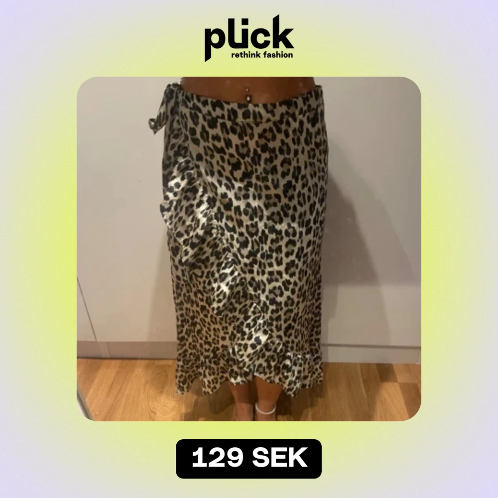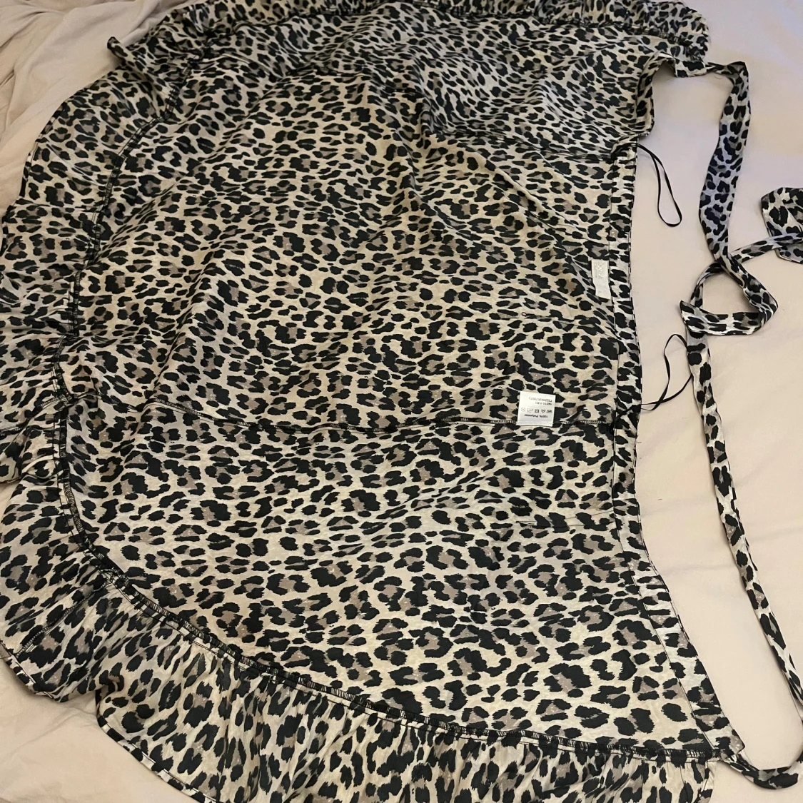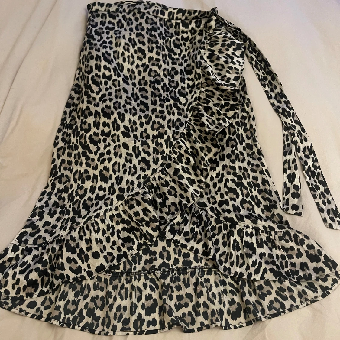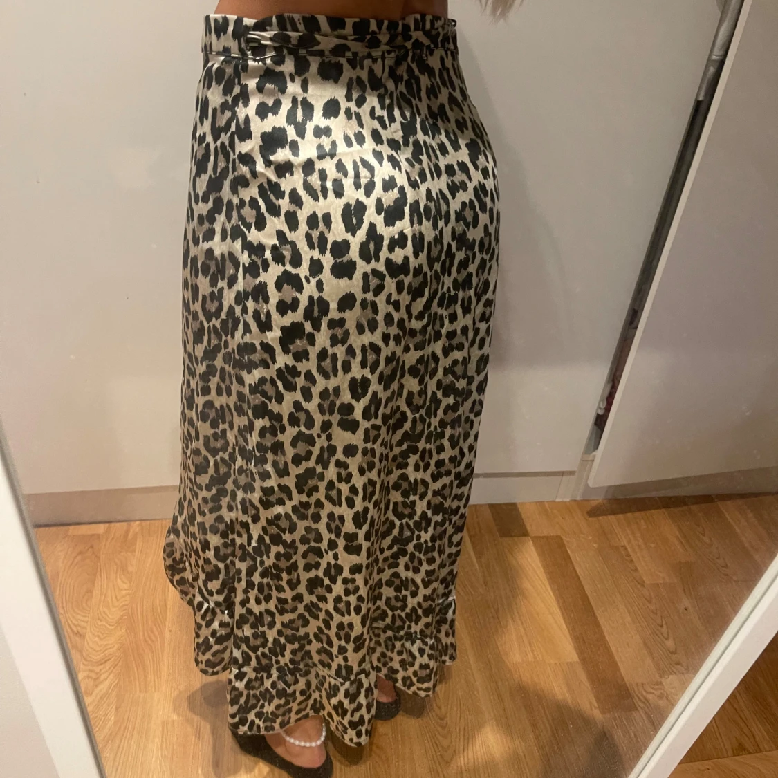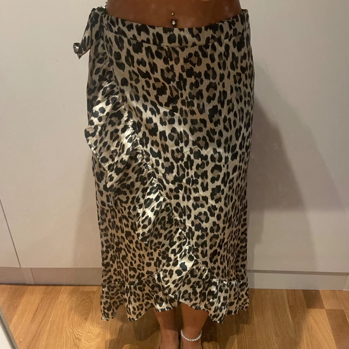 Jätte fin leopard kjol i silkesmaterial, justerbar storlek, skulle säga att den passar allt från XS-L, du knyter den själv runt om så att den passar, tyget går omlott över varandra. Helt i nyskick, aldrig använd!