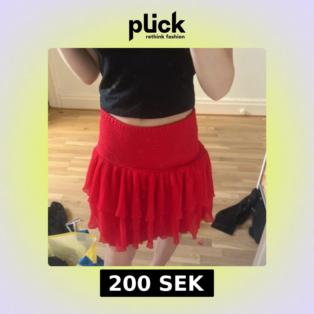 Superfin röd kortkjol från Lindex med bred smock i midjan och flera lager volanger. Kjolen är gjord i återvunnen polyesterblandning och har en luftig, plisserad känsla som ger extra rörelse. Perfekt för dig som vill sticka ut med färg och volym.