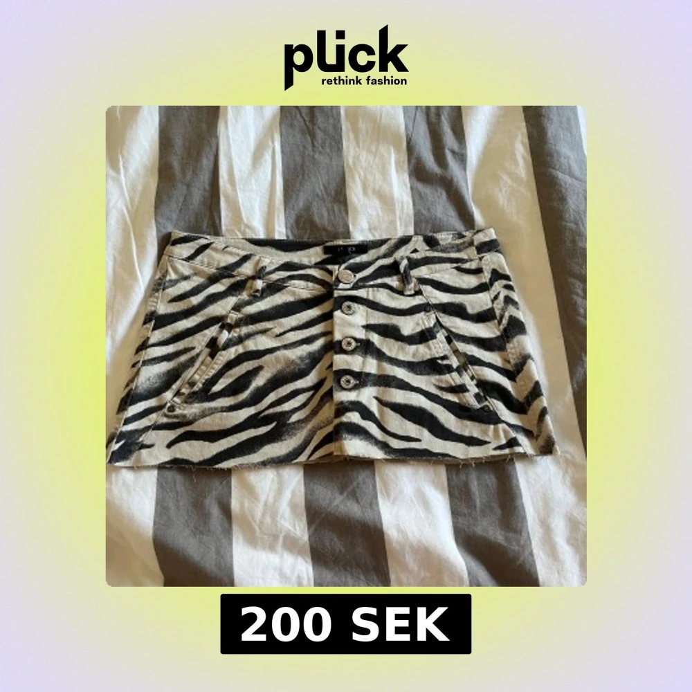 Snygg kortkjol från Lindex med zebramönster i svart och beige. Kjolen har fyra framknappar, bälteshällor och både fram- och bakfickor. Materialet är jeansliknande bomull som ger en cool och edgy vibe. Perfekt för dig som gillar att sticka ut!