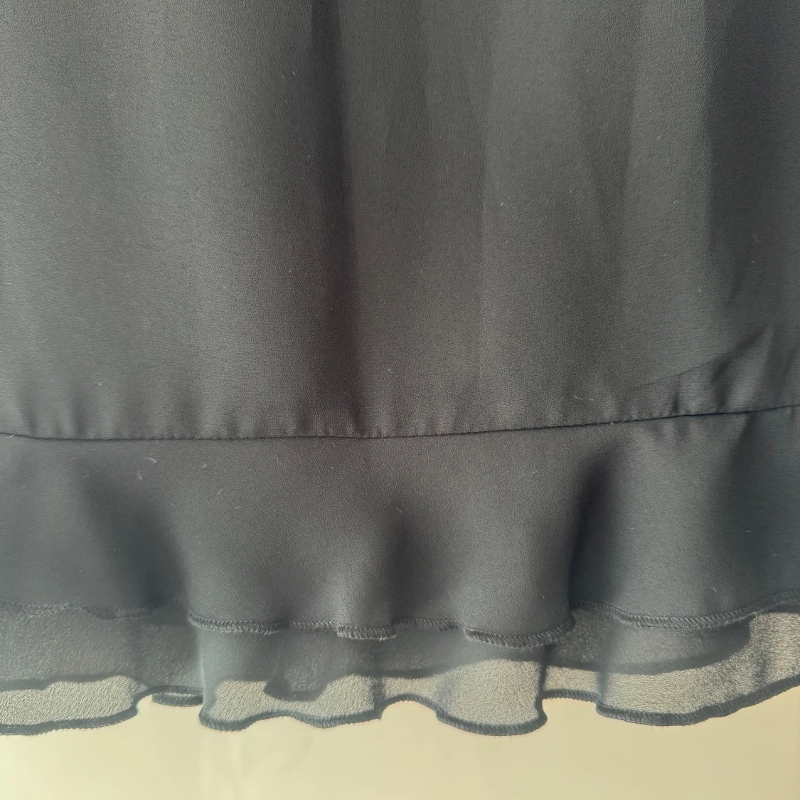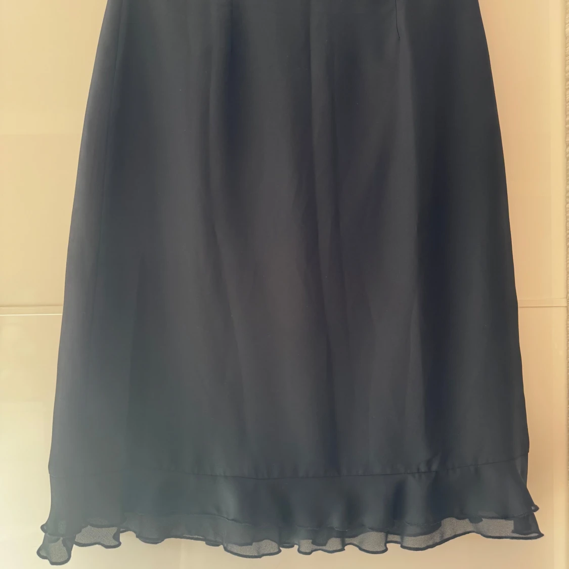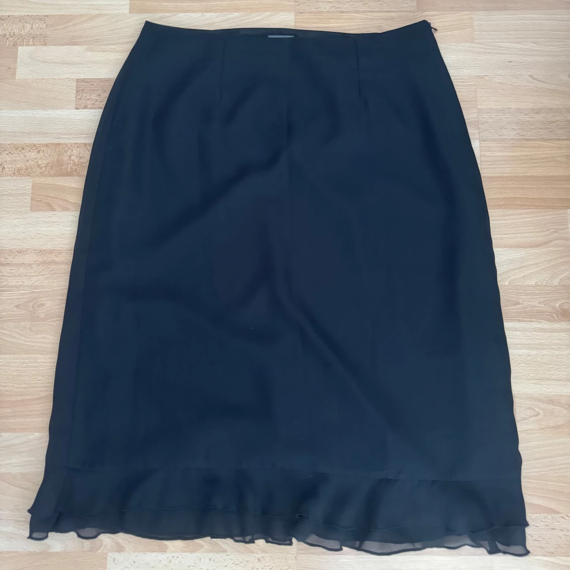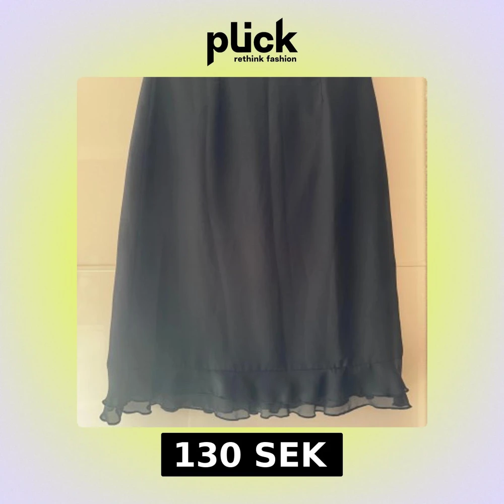 Svart kjol från Lindex i 100% polyester. Kjolen har en rak passform och är dekorerad med en snygg volang längst ner som ger en extra touch. Perfekt för dig som gillar stilrena plagg med en liten twist. Storleklapp avklippt, men den är L, midjan 84cm.