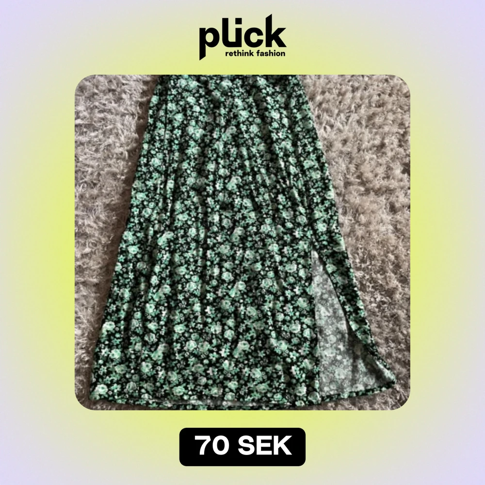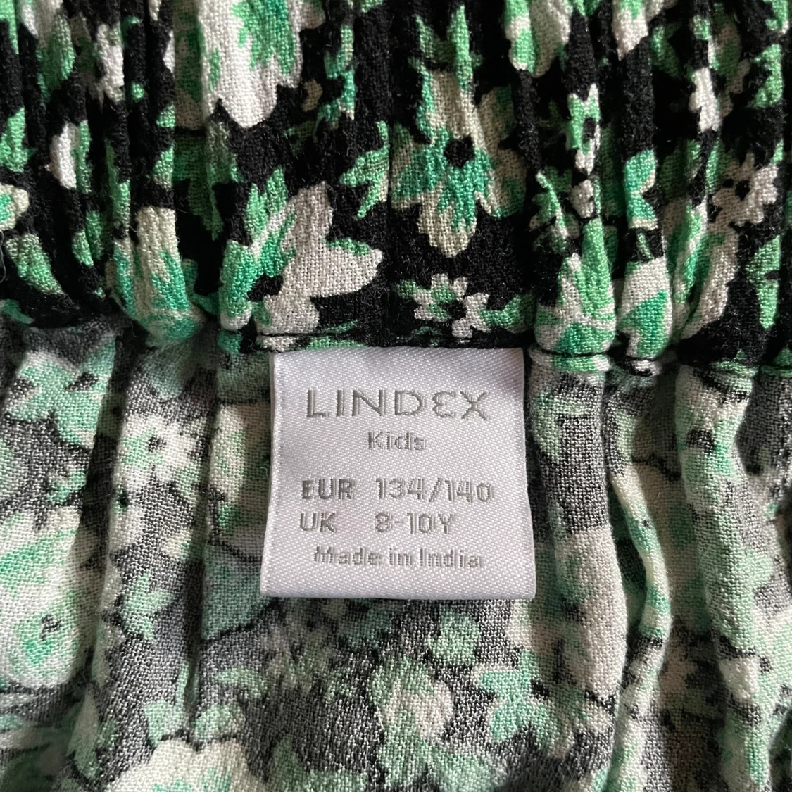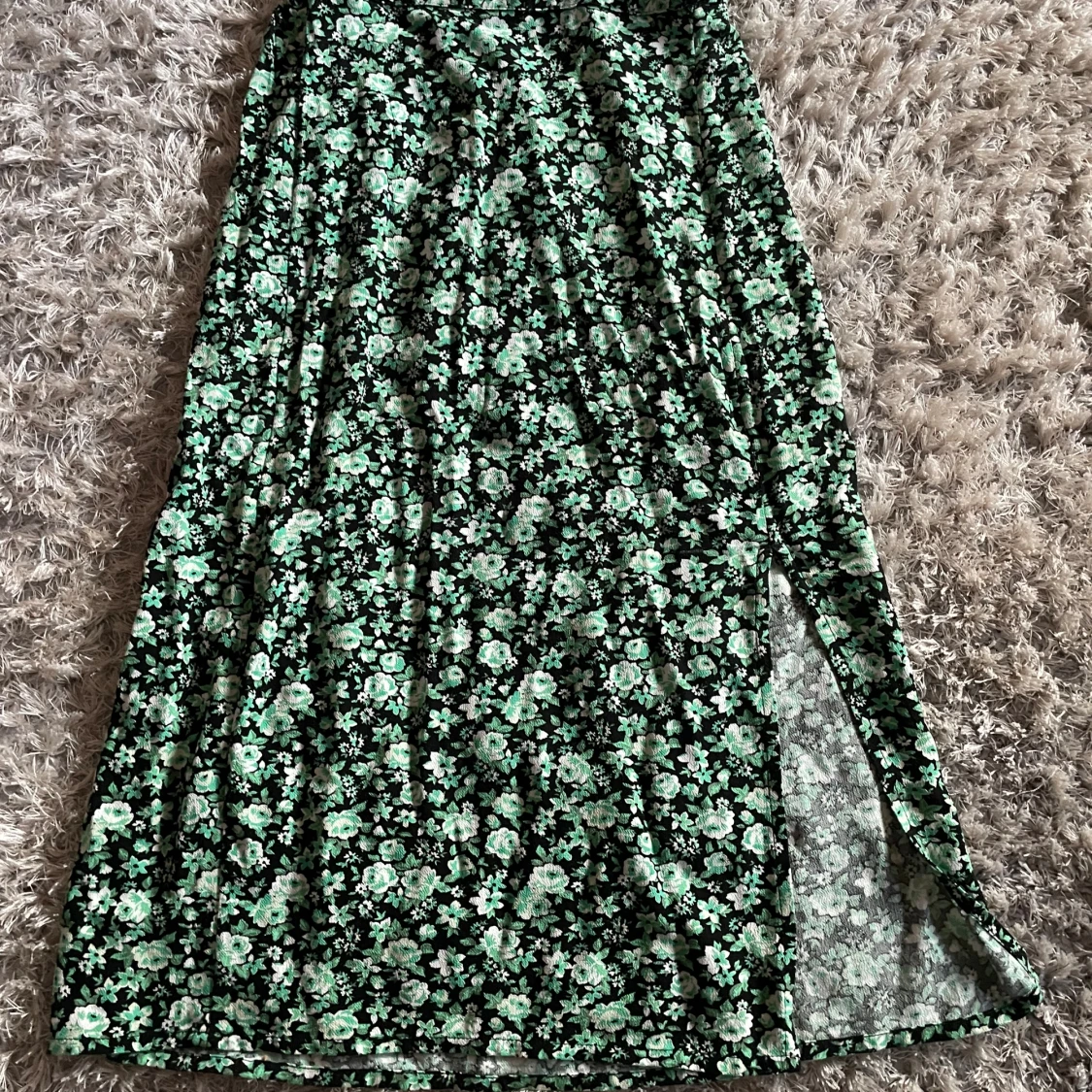 Blommig grön kjol. Från Lindex. Lång och har en slits. Resår där bak. 8-10 år.