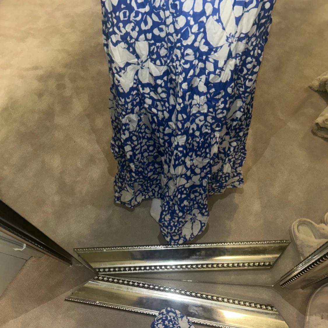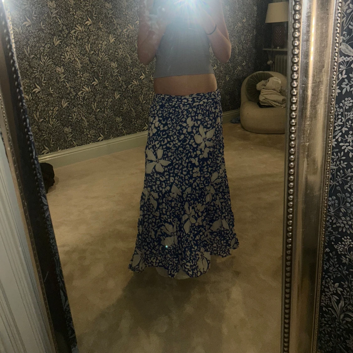 Säljer en blåvit långkjol med stort blommigt mönster. Kjolen har en flowy passform och är perfekt för dig som gillar en avslappnad men ändå snygg stil. Materialet känns lätt och luftigt.