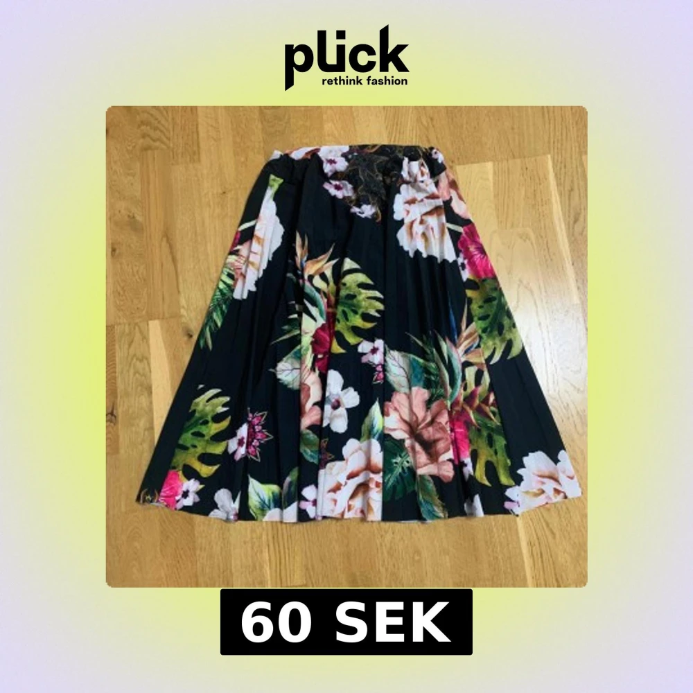 Säljer en svart plisserad kjol med stort blommigt mönster i grönt, rosa, vitt och rött från New Style Italy. Kjolen har elastisk midja och är perfekt för dig som gillar färgstarka prints och flowig känsla.