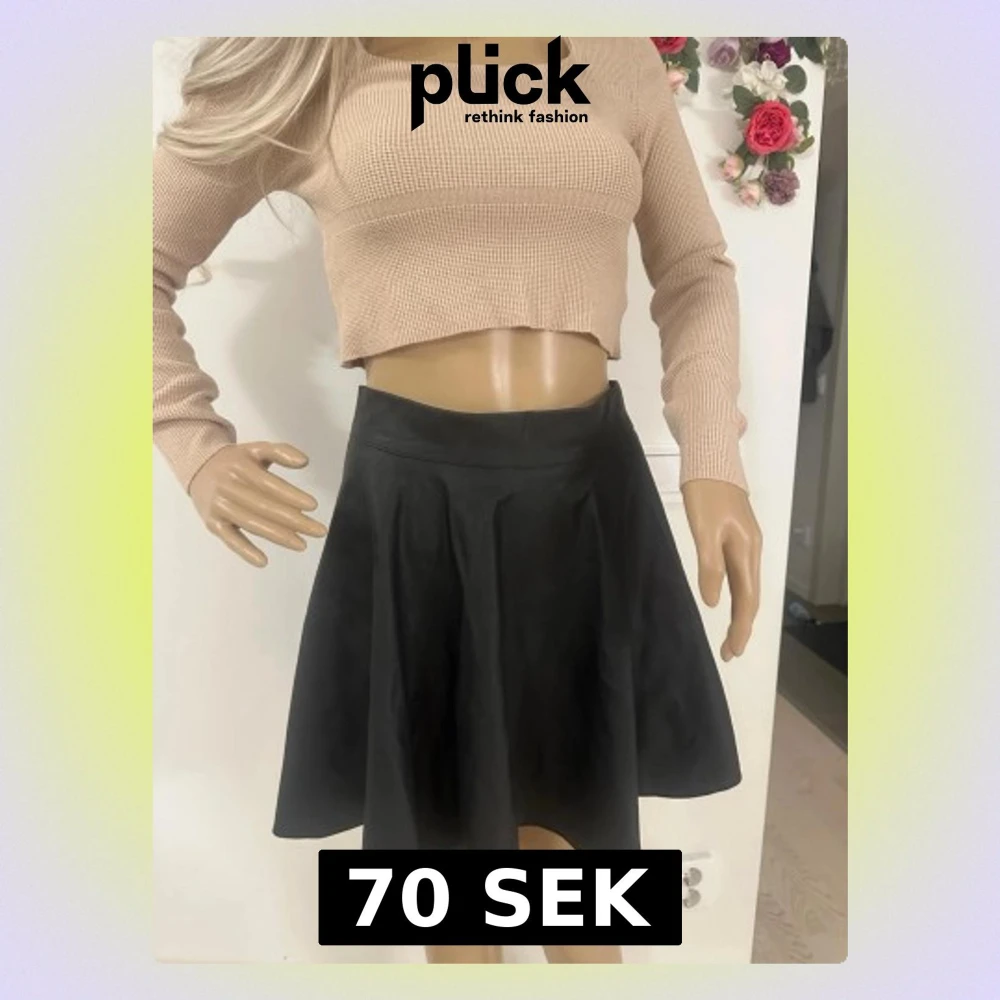 Säljer en svart, kort skinnkjol med snyggt fall och markerad midja. Kjolen har en guldig dragkedja i sidan som ger en cool detalj. Perfekt för dig som gillar en stilren look med lite edge. Passformen är normal och materialet känns mjukt och följsamt.