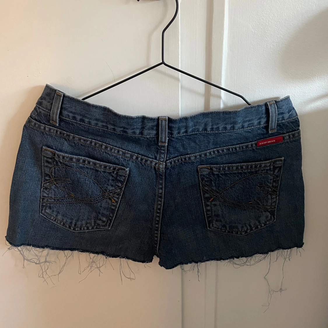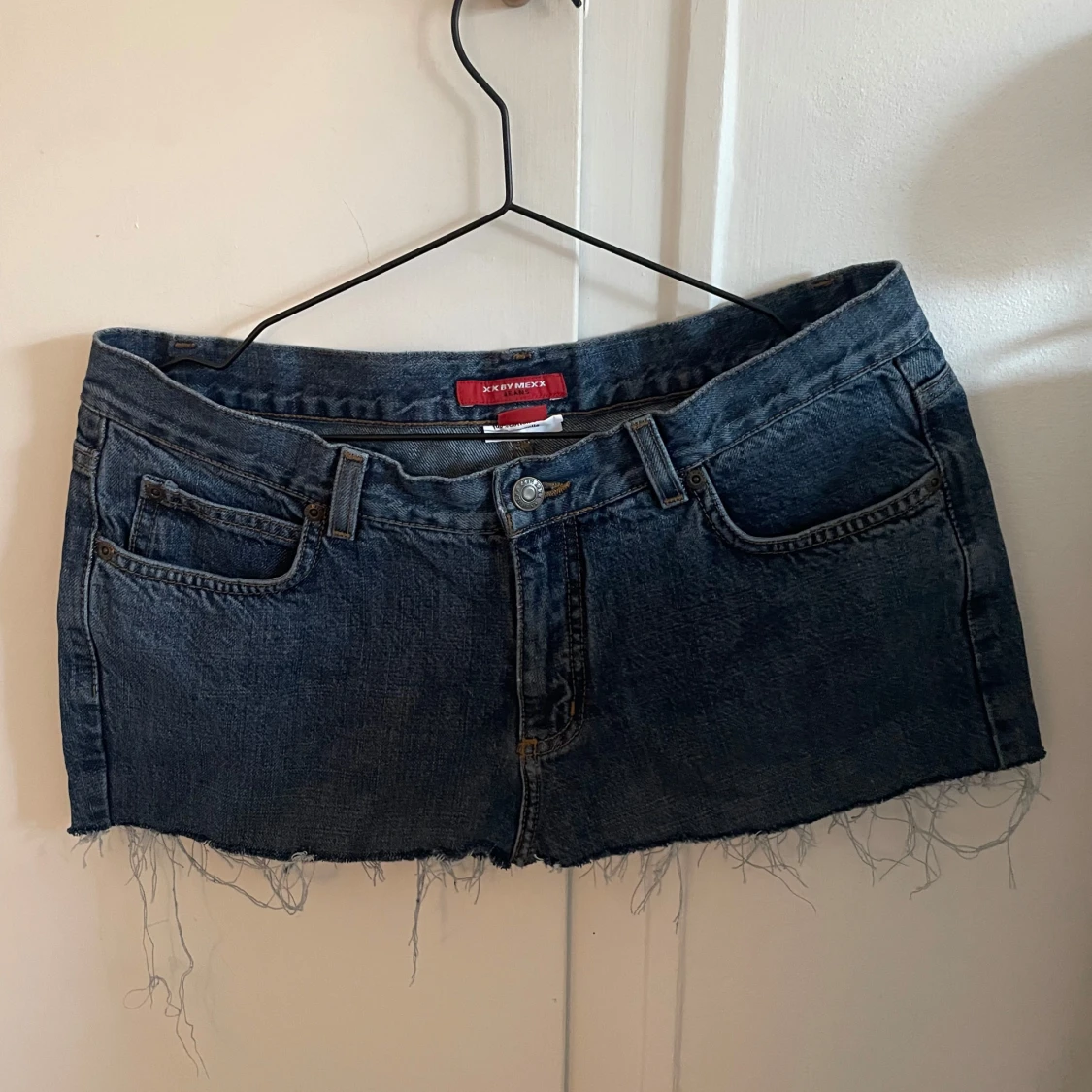 Snygg jeanskjol från Mexx i mörkblå denim med fransig nederkant. Midjemått tvärsöver: 38cm längd: 28cm