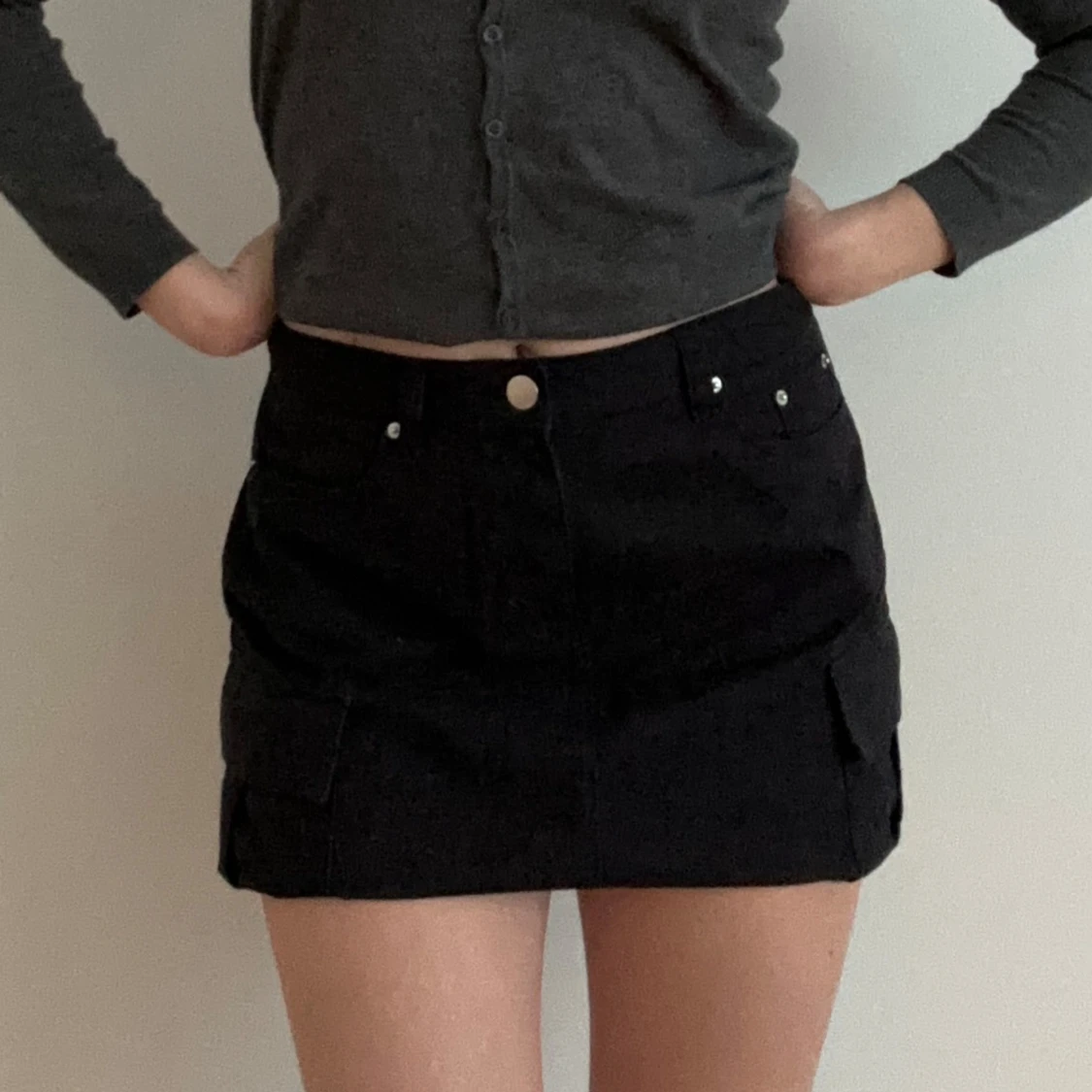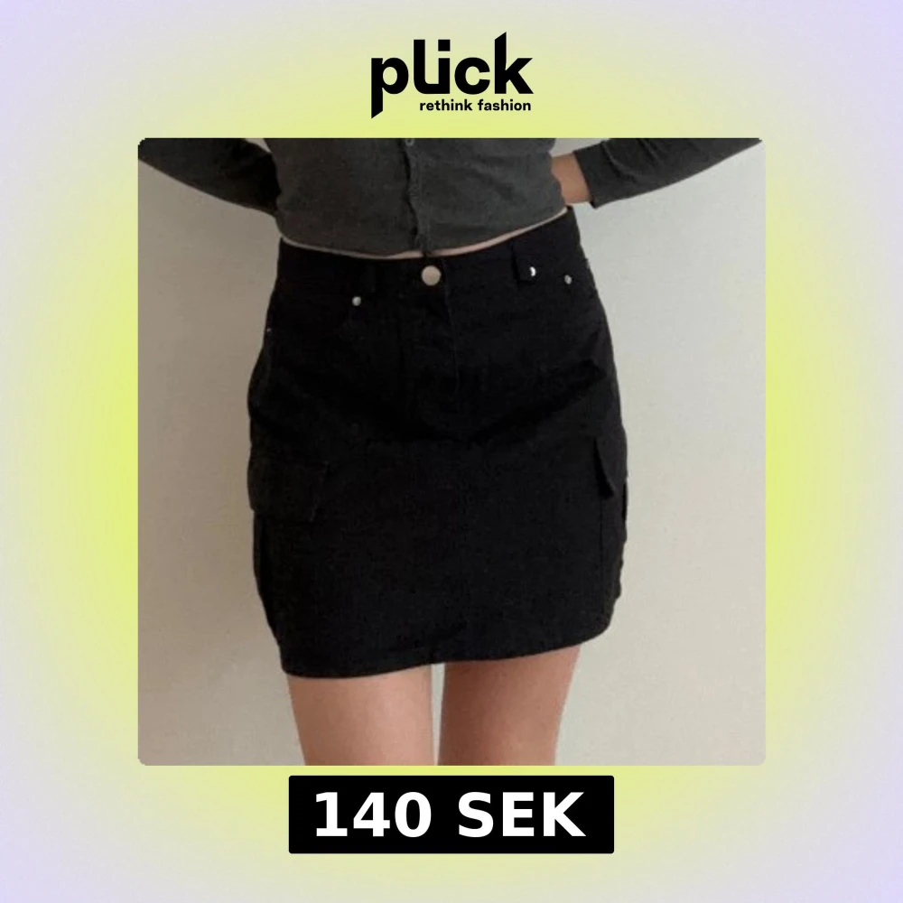 Snygg svart kortkjol med praktiska fickor på sidorna. Kjolen har en klassisk design med knapp och dragkedja framtill. Perfekt för en stilren look.