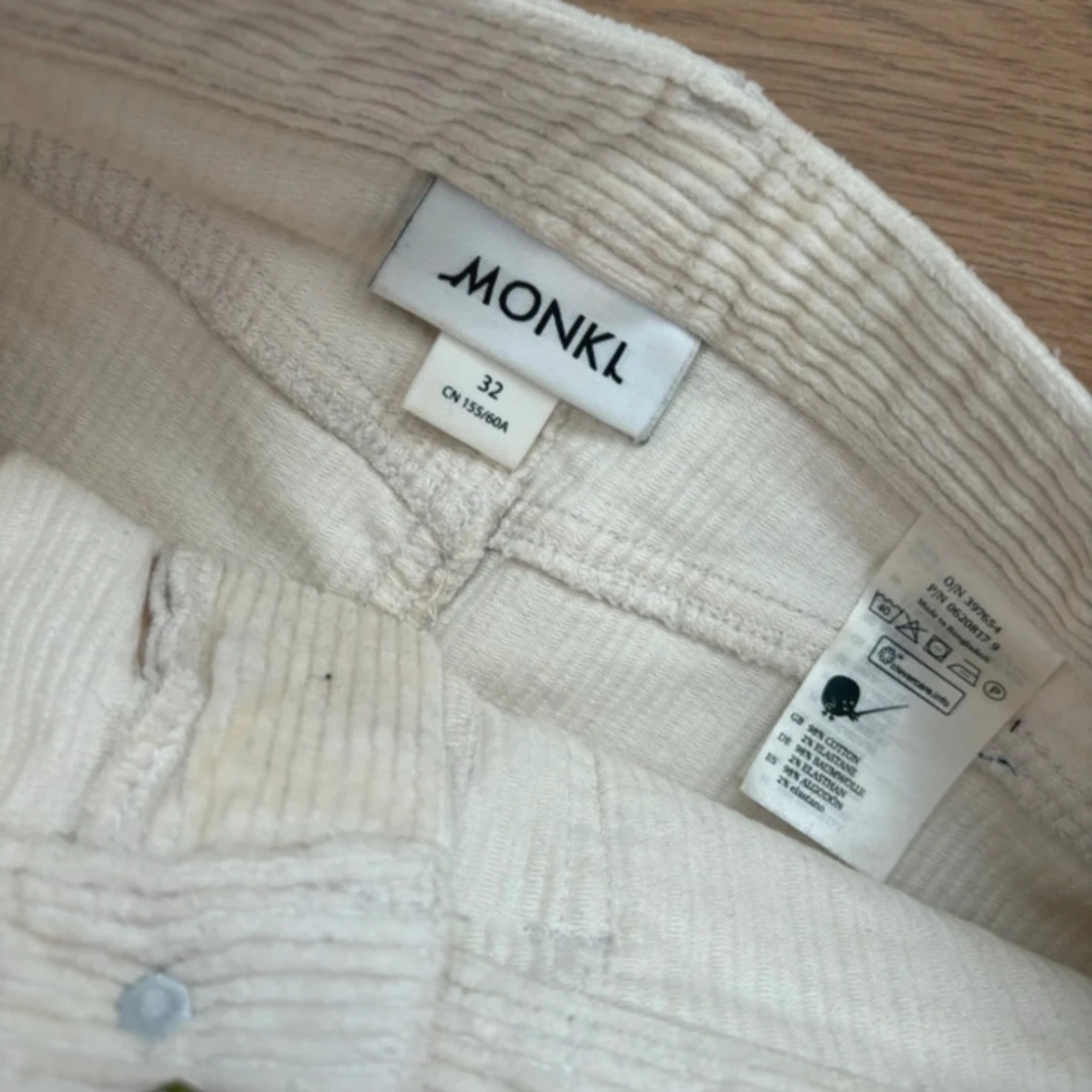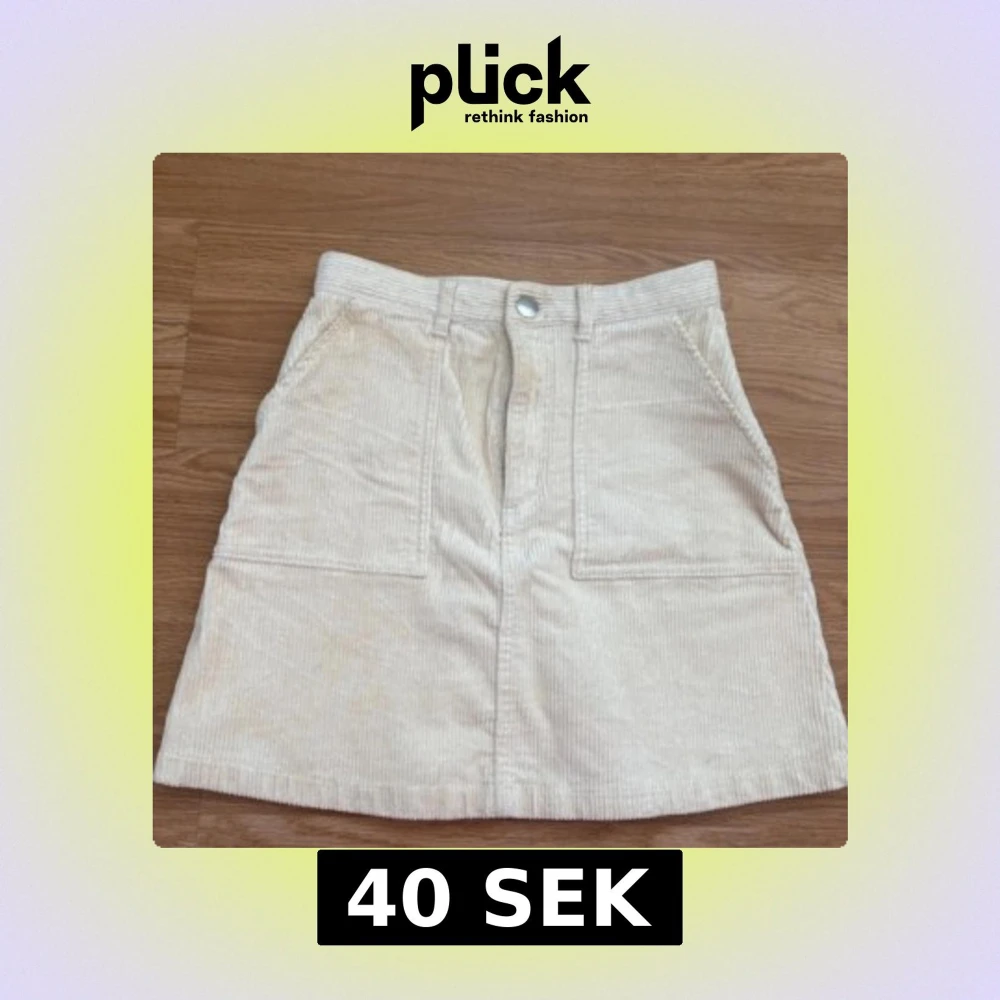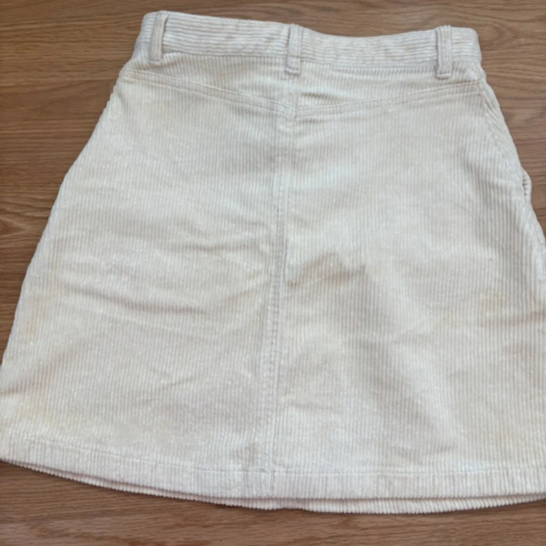 Säljer en beige manchesterkjol från Monki med två stora fickor framtill och knappstängning i midjan. Kjolen har bälteshällor och är i en klassisk A-linjeformad modell.