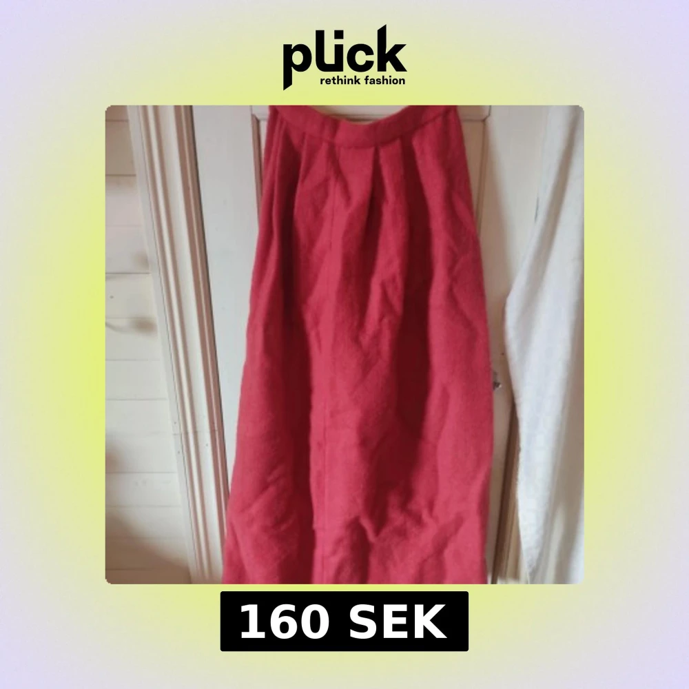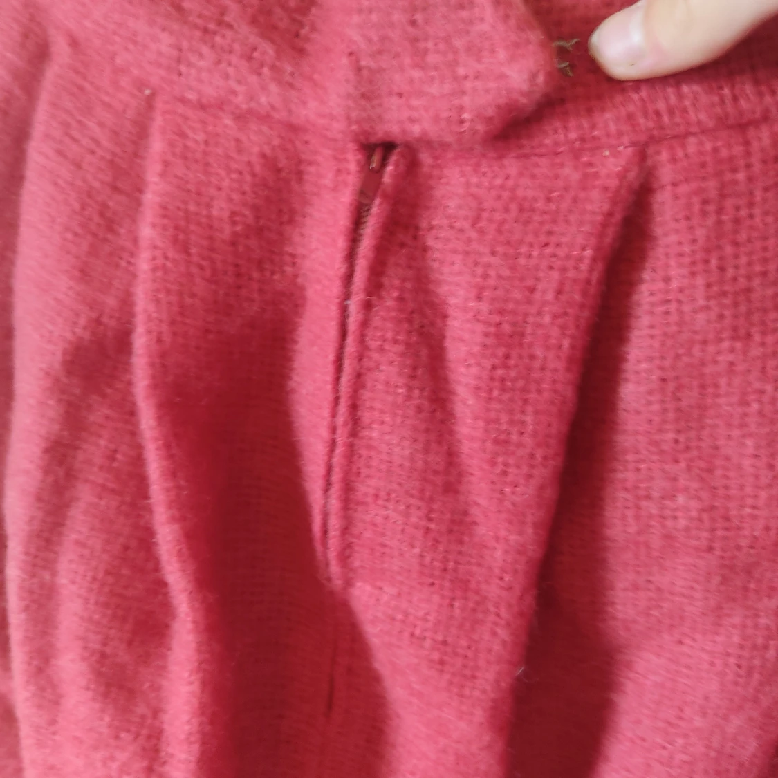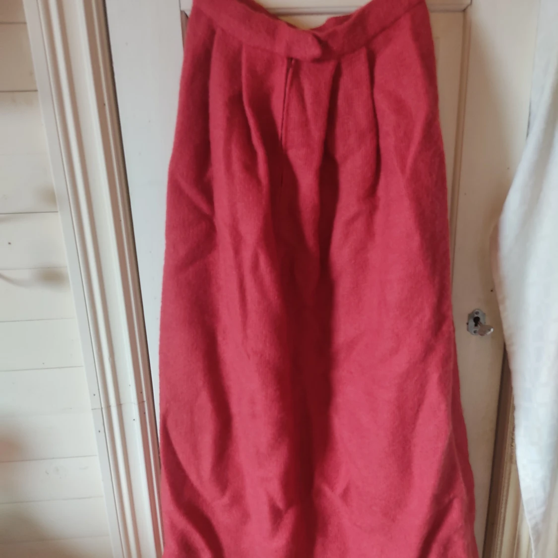Säljer en röd långkjol i ull med knapp och dragkedja på baksidan. Kjolen har en rak passform som samlas i midjan. Den har inget undertyg så är menad att ha med ett par underbyxor eller en underkjol. Den är perfekt att ha de stunder man vill ha kjol under vintern men inte vill frysa.