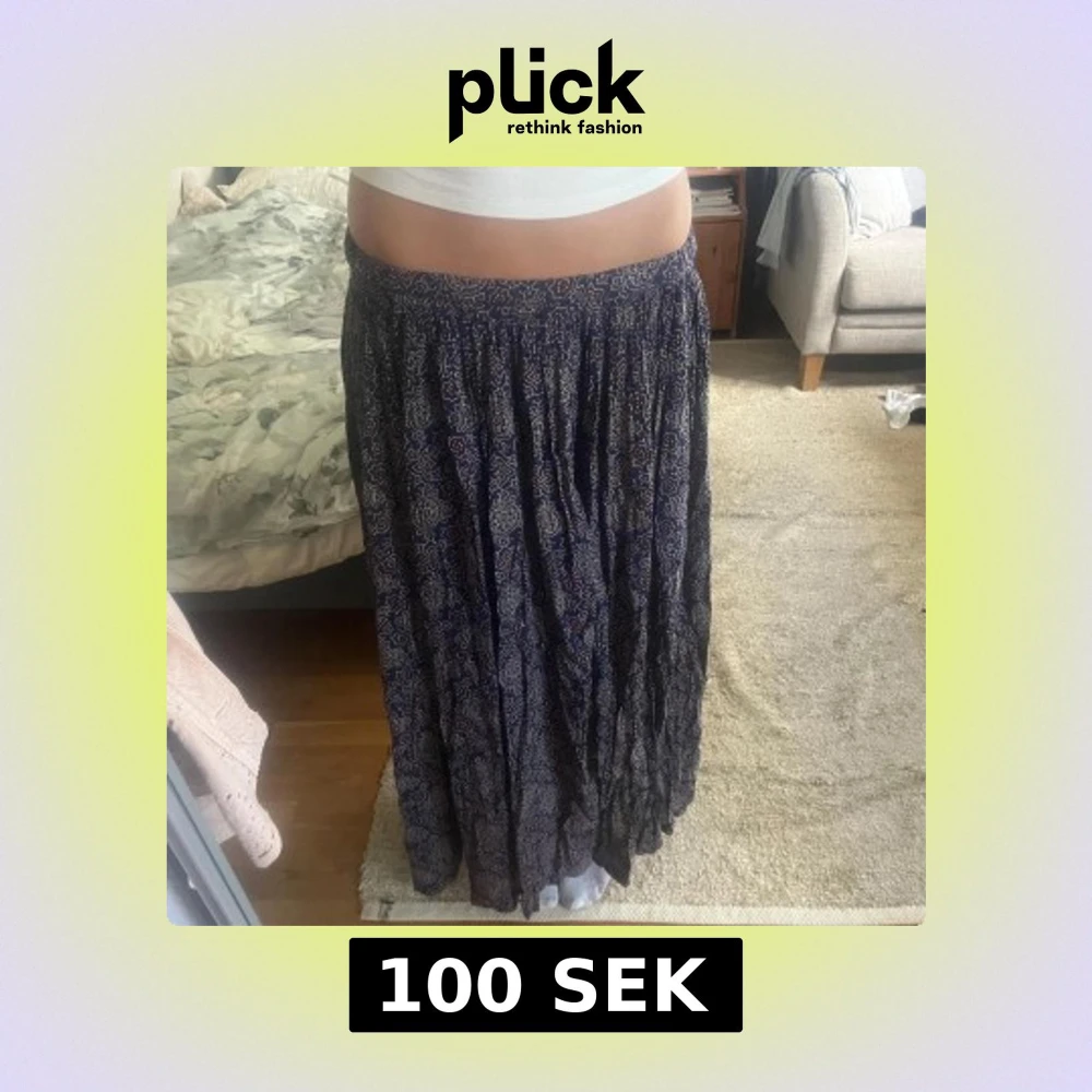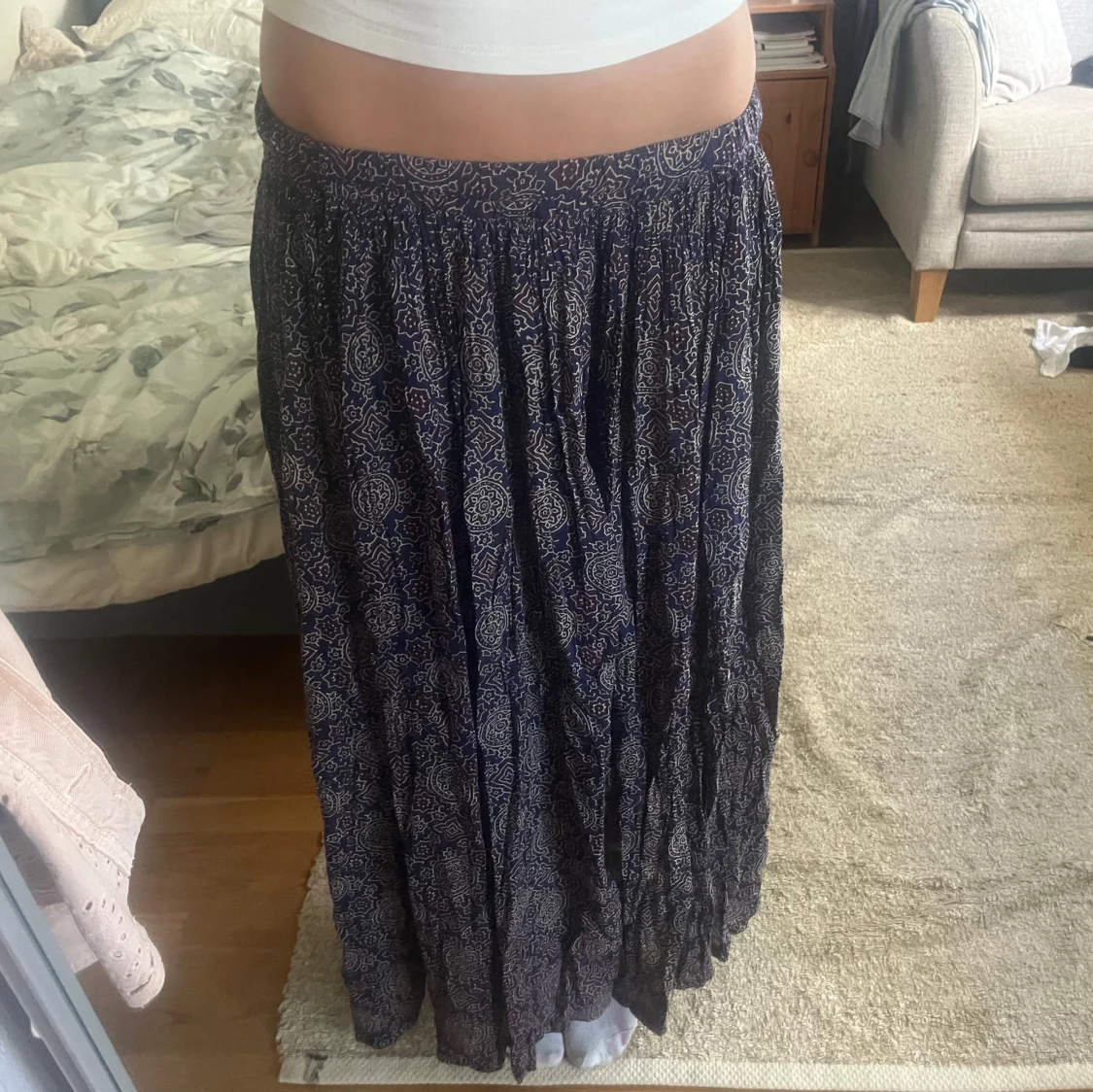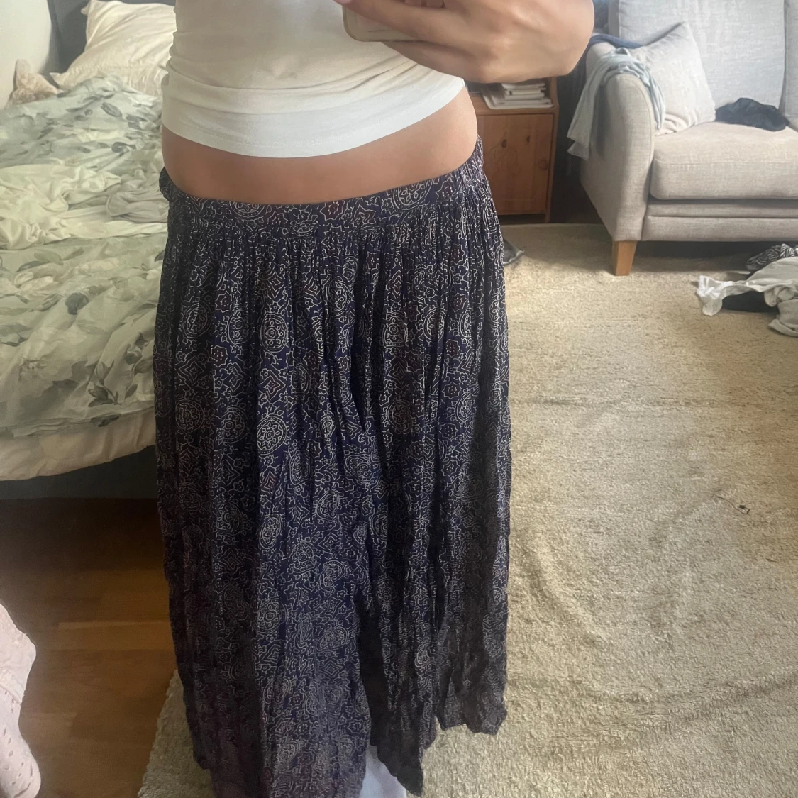 Säljer en flowy långkjol i marinblått med vitt och vinrött mönster. Kjolen har resår i midjan och är gjord i ett lätt och luftigt material, perfekt för varma dagar. Mönstret är detaljerat och ger en bohemisk vibe. Superskön och snygg till både sneakers och sandaler. Vet ej märke.