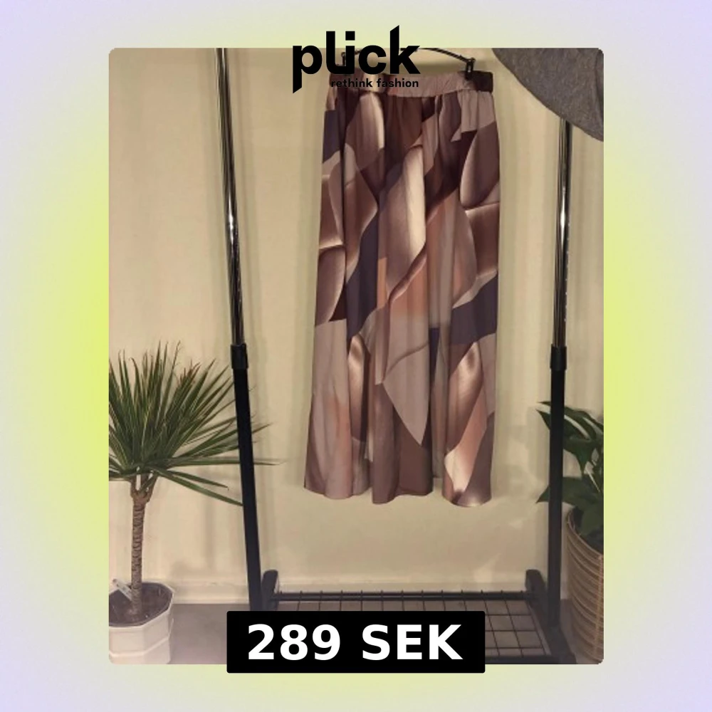 En flowy långkjol med abstrakt mönster i beige, brun och lila toner. Kjolen har ett glansigt material som ger en lyxig känsla. Storlek M, men passar även S då det beror på hur ni gillar er passform.