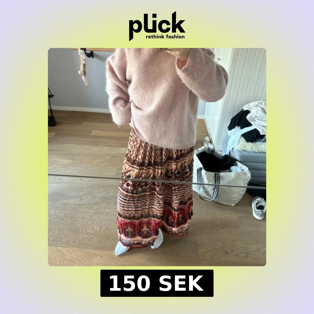 Säljer en vacker långkjol med ett unikt mönster i varma toner av rött, brunt och beige. Kjolen har en lös passform och är perfekt för att ge en bohemisk touch till din outfit. Den är dekorerad med detaljer som ger en extra dimension till looken. Köpte den utomlands så den har en lite speciell lukt, går säkert att tvätta bort.