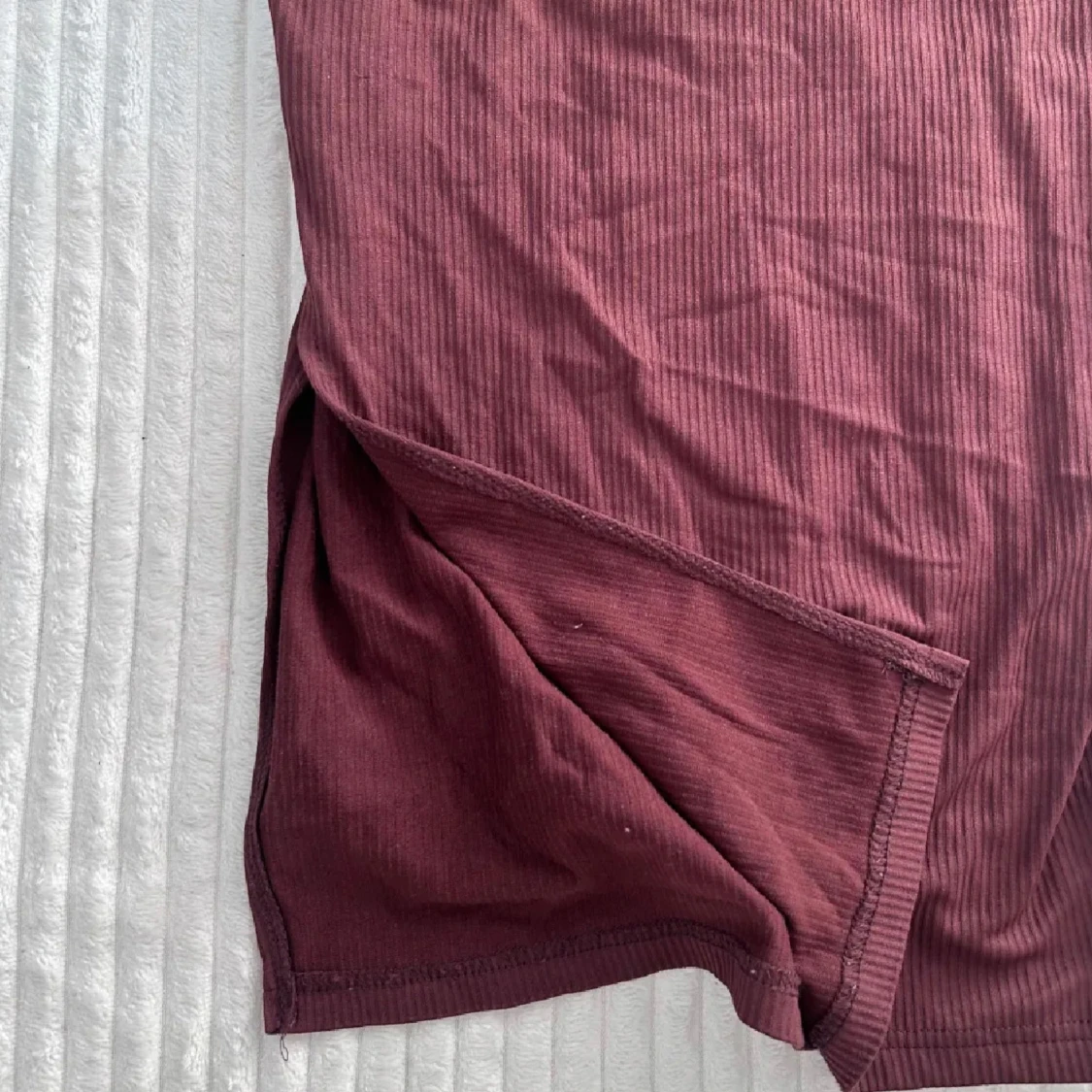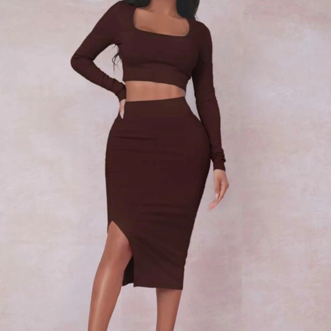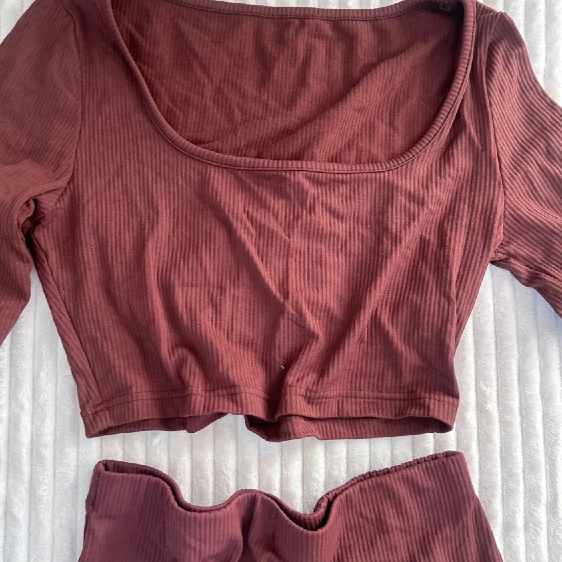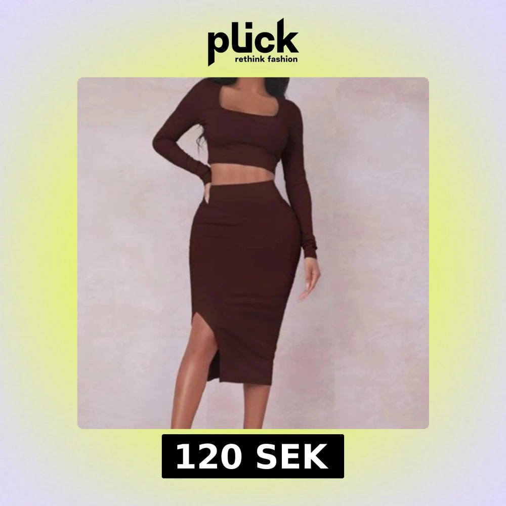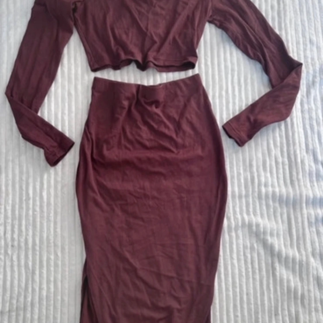 Säljer en mörkbrun långkjol med matchande topp i ribbad struktur och snygg slits på sidan. Kjolen har en tight passform och är gjord i mjukt bomullsmaterial.