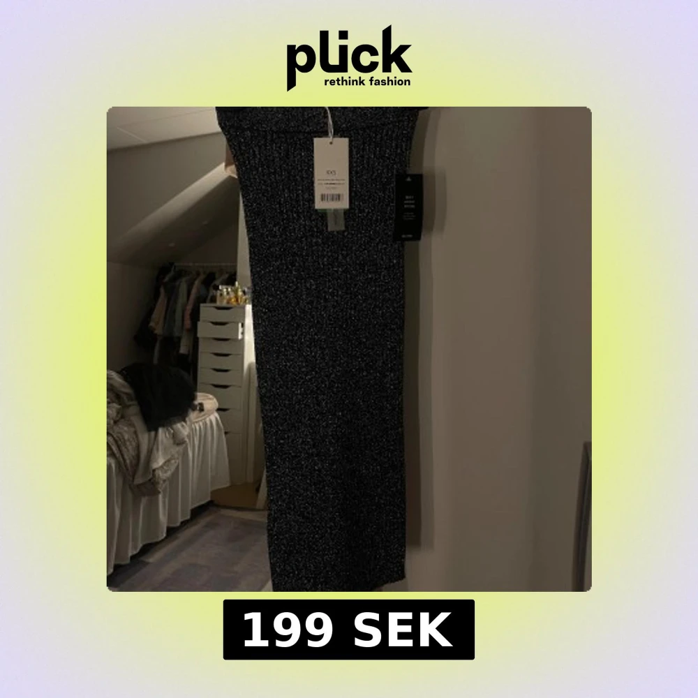 Svart/grå glittrig kjol i ribbat stretchtyg, storlek XXS( passar xs). Kjolen är helt ny med lappen kvar och säljs endast på grund av fel storlek. Den är figurnära och bekväm med stretchigt material som formar sig fint efter kroppen.