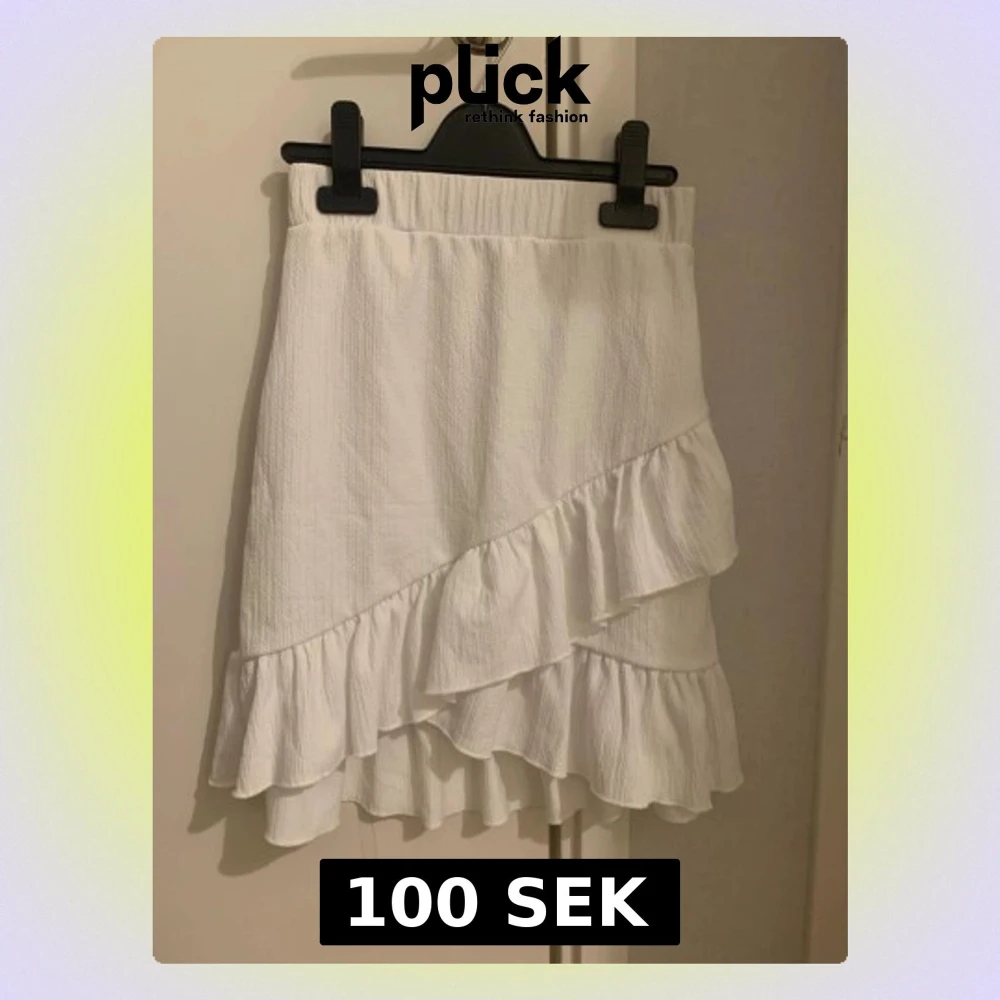 Supersöt vit kjol från Nelly i storlek XS. Kjolen har volanger nere vid kanten och ett elastiskt midjeband för skön passform. Är oanvänd i nytt skick. Materialet är lätt och luftigt, perfekt för varma sommardagar och för dig som vill ha en fin fräsch look.