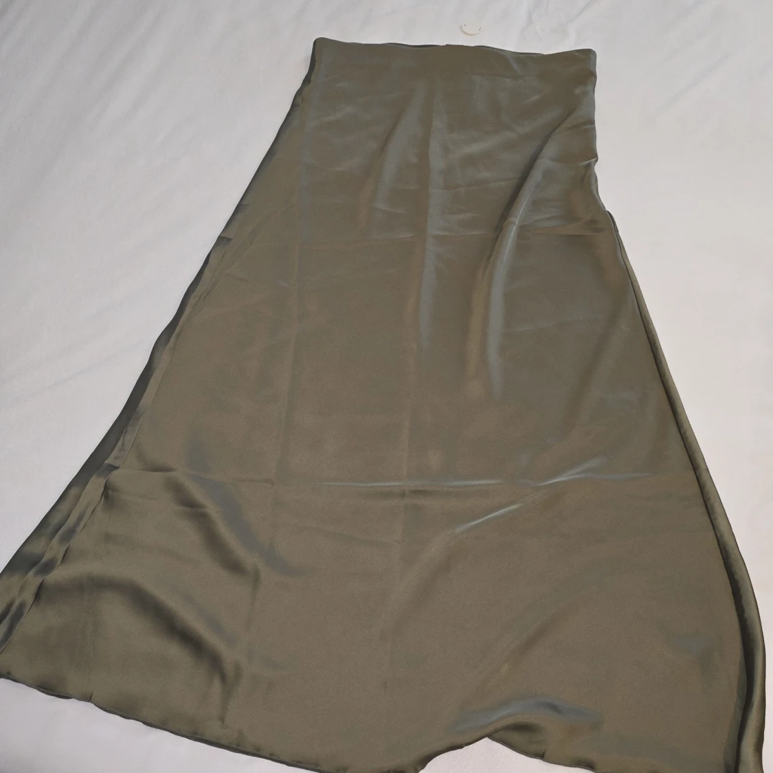 Snygg olivgrön långkjol från Lindex i ett glansigt material. Kjolen är tillverkad av återvunnen polyester och har en elegant och flytande passform. Perfekt för att ge en stilren touch till din outfit.
