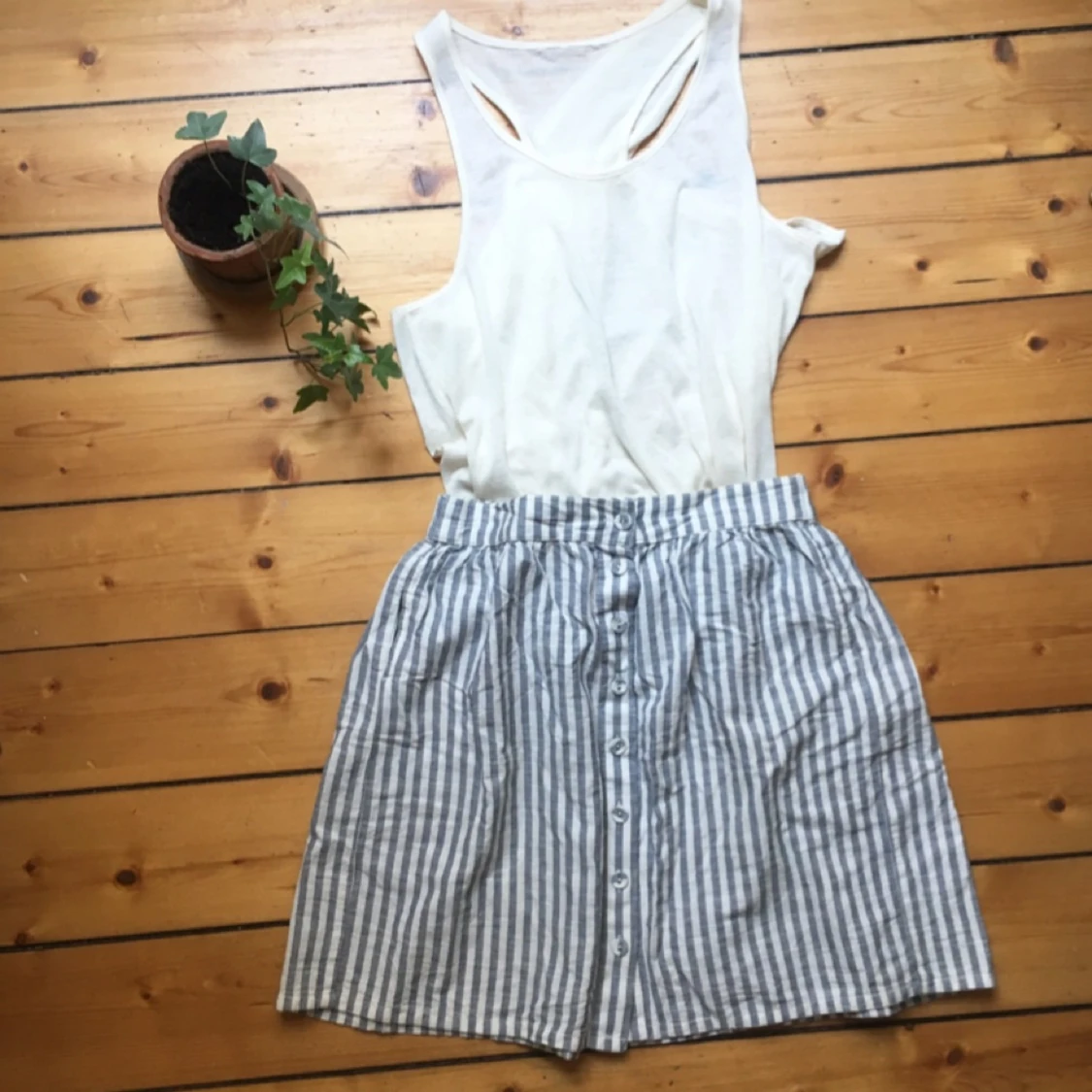 En grå och vit randig kjol med små knappar framtill. Tillverkad i bomull och har resor i midjan! Fint skick! 🌟