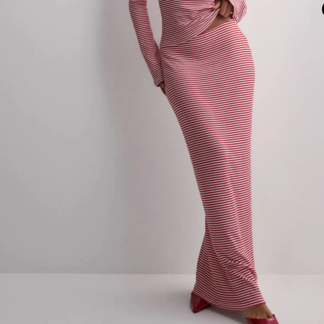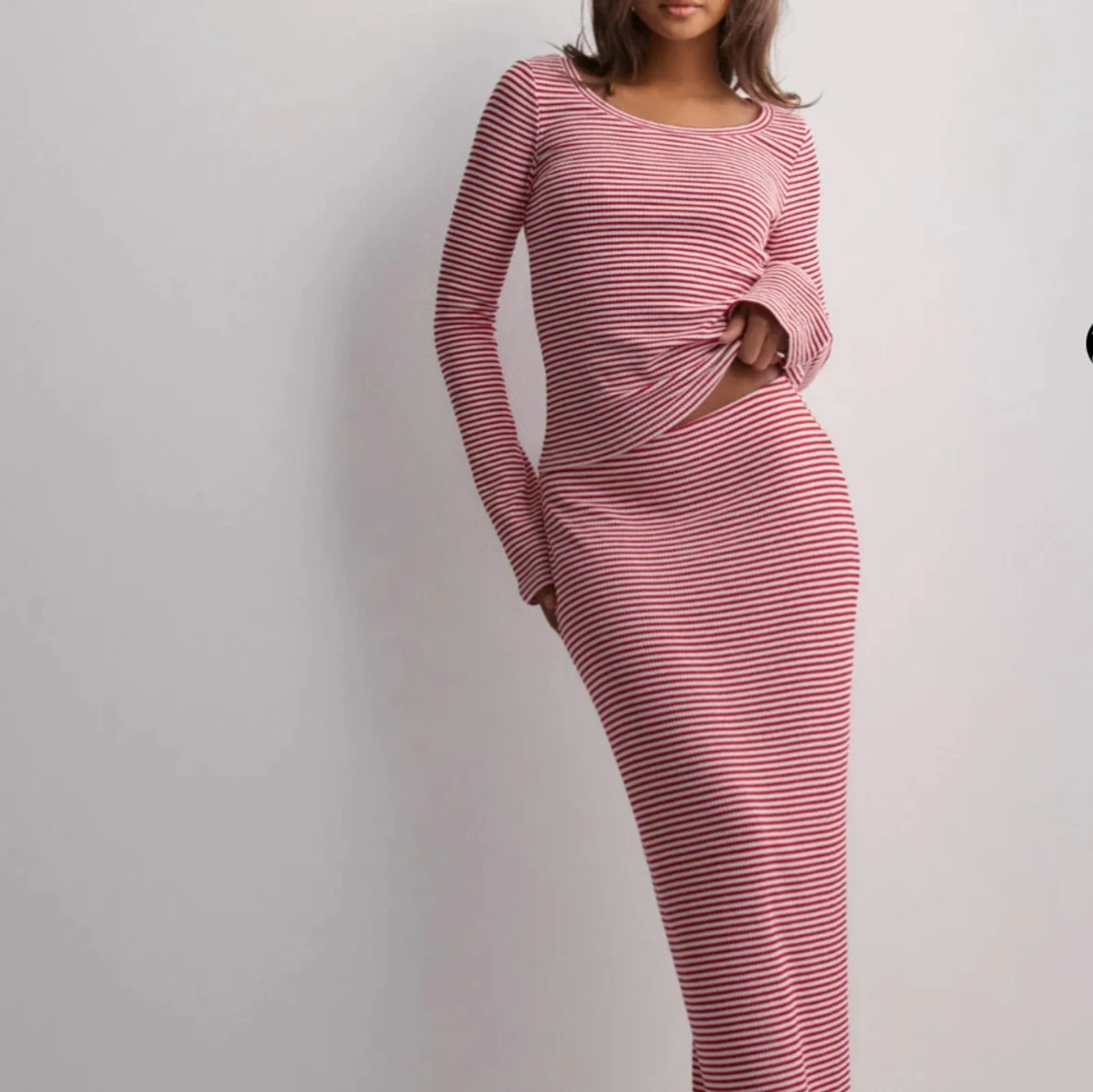 Supersnyggt vit, röd randigt set från Nelly. Perfekt till hösten/vinter. Formar kroppens former fint. Aldrig använt. Svårt att få tag på.