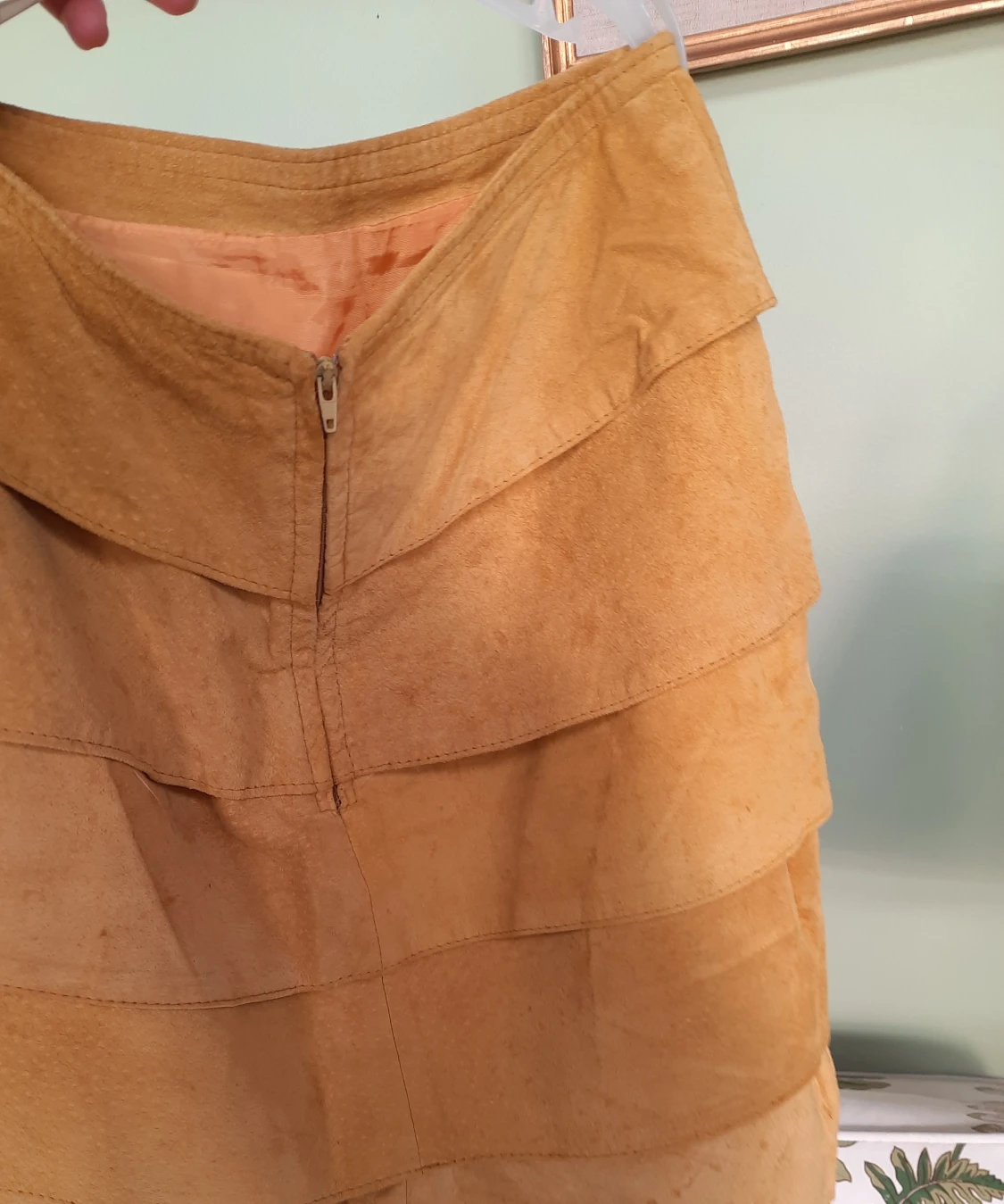 Layers Suede, Fitted Knee-Length Skirt Använd ett fåtal gånger med några små prickar på vissa ställen. Normal i storleken och passar mig bra i storlek xs. Den är från Danier därför priset. Säljer då det inte var min färg!