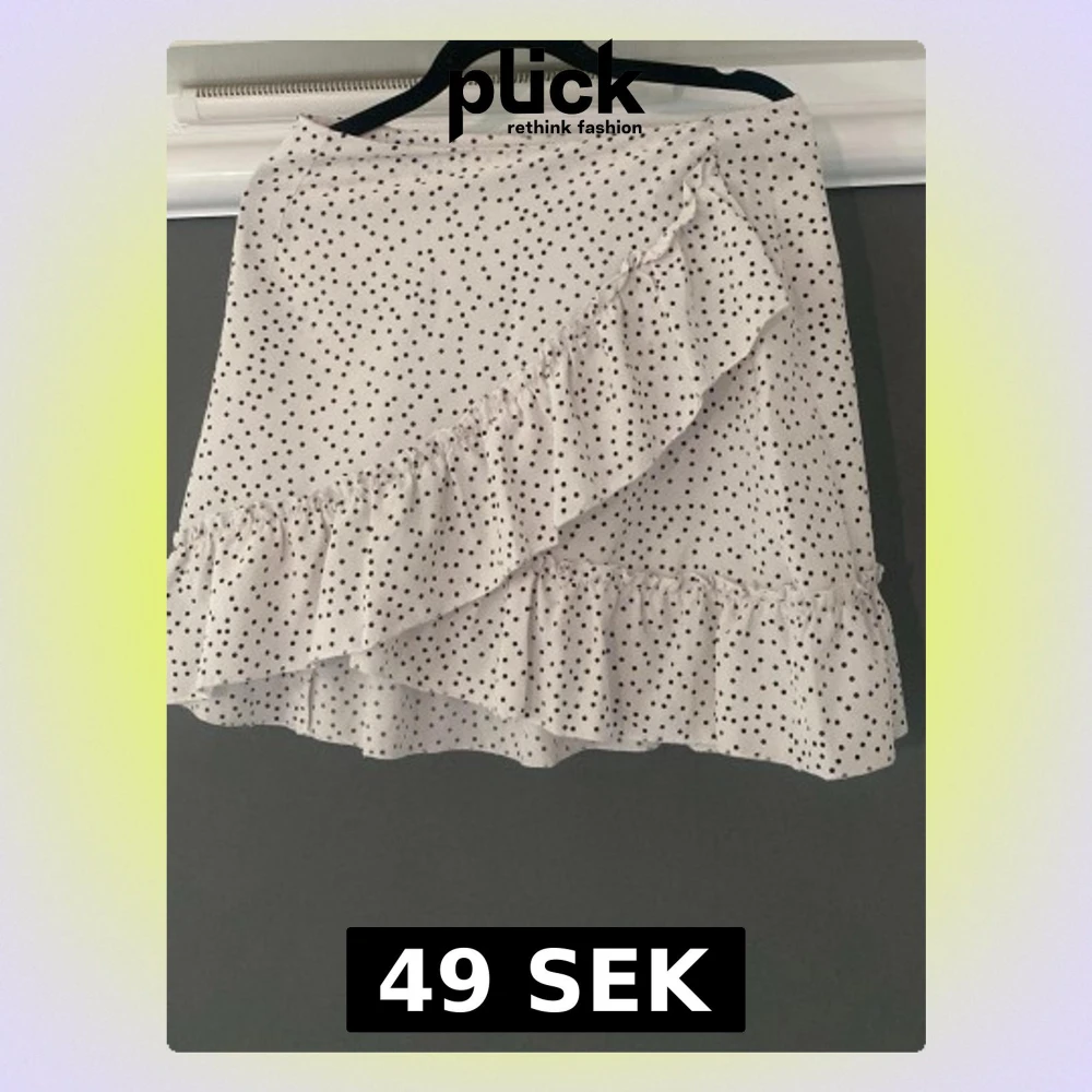 Superfin vit kortkjol från SHEIN med svarta prickar och volangdetaljer. Kjolen har omlottkänsla framtill och är perfekt för dig som gillar en söt och trendig look. Lätt och luftig, passar perfekt till varmare dagar.