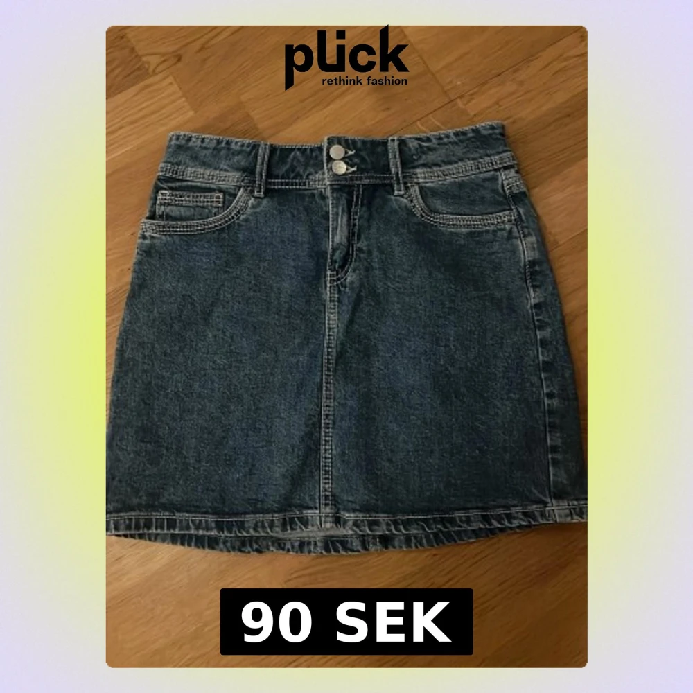 Säljer en klassisk blå jeanskjol i kort modell med tydliga kontrastsömmar, bälteshällor och fem fickor. Kjolen har två knappar framtill och snygga bakfickor med dekorativa sömmar. Perfekt till sommaren och är lätt att styla. Den är från Lindex i storlek 170 och nästan aldrig använd. Pris går att diskuteras!
