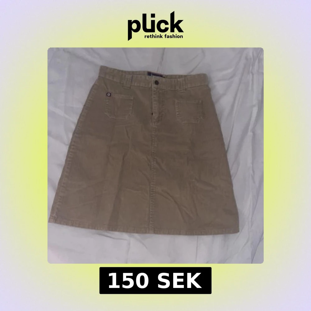 Säljer en beige manchesterkjol från Crocker med klassisk femficksdesign och bälteshällor. Kjolen har raka linjer och är lätt A-linjeformad, perfekt för dig som gillar en enkel och tidlös stil. Snygg detalj med stjärnlogga på fickan och insidan av linningen.