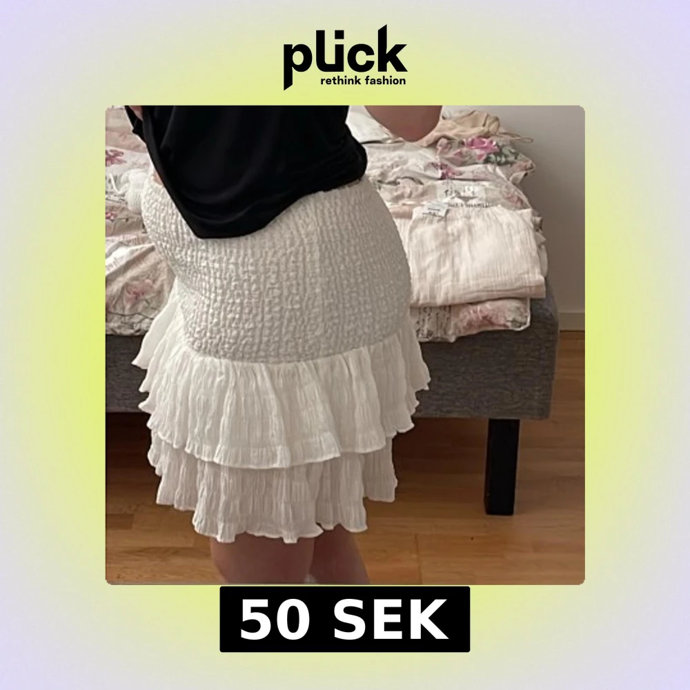 Säljer en söt vit volangkjol med elastisk midja. Kjolen har flera lager av volanger som ger en lekfull look. Perfekt för varma dagar och kan enkelt matchas med olika toppar.