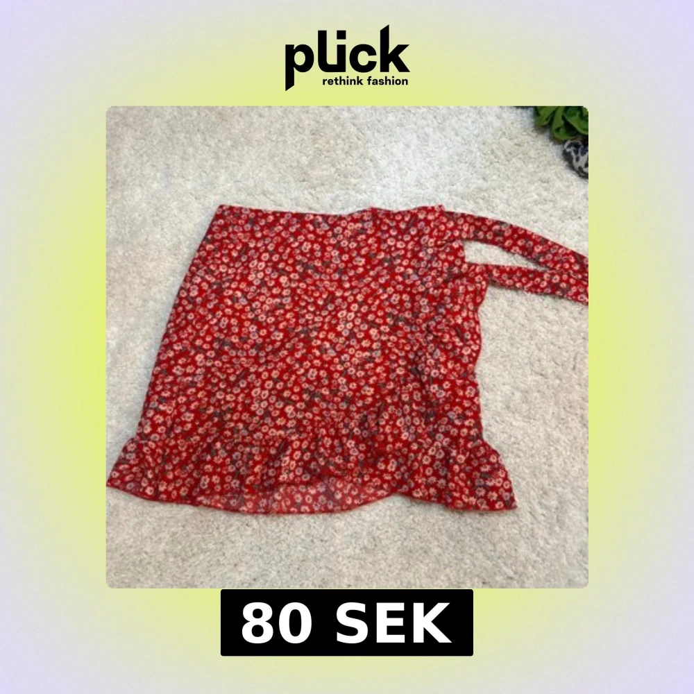 röd omlottkjol med små vita och gula blommor. Kjolen har volang längst ner och knyts i midjan