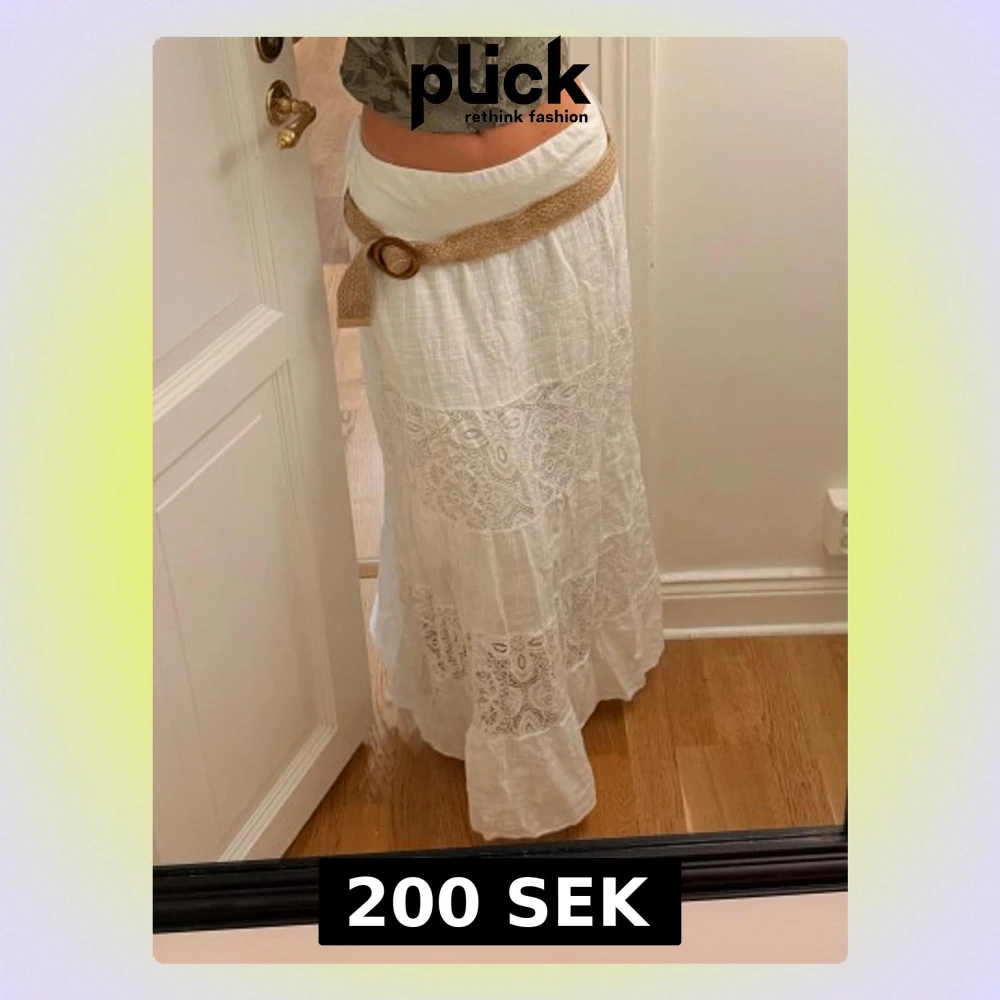 Säljer en vit långkjol med snygga spetsdetaljer och ett flätat bälte som tillhör. Har köpt kjolen i en butik i Köpenhamn men kommer tyvärr inte ihåg vad butiken hette.