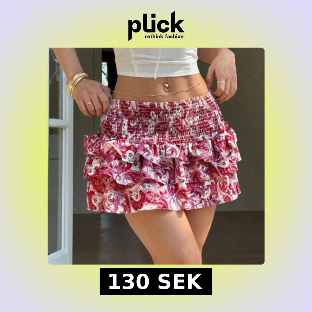 Supersöt kort kjol med volanger och smock i midjan. Paisleyinspirerat mönster i rött och vitt ger en riktigt somrig vibe. Kjolen har en figurnära passform upptill och faller ut i två lager volanger. Perfekt för dig som gillar färg och mönster!
