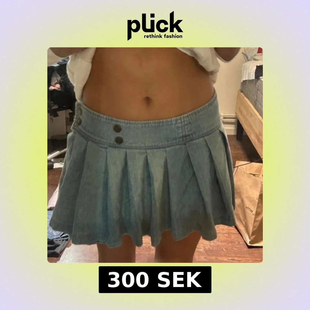 Superfin kort plisserad jeanskjol i ljusblå denim. Kjolen har bred linning med fyra metallknappar framtill och tydliga veck som ger en snygg volym. Perfekt för dig som gillar en trendig och avslappnad stil.