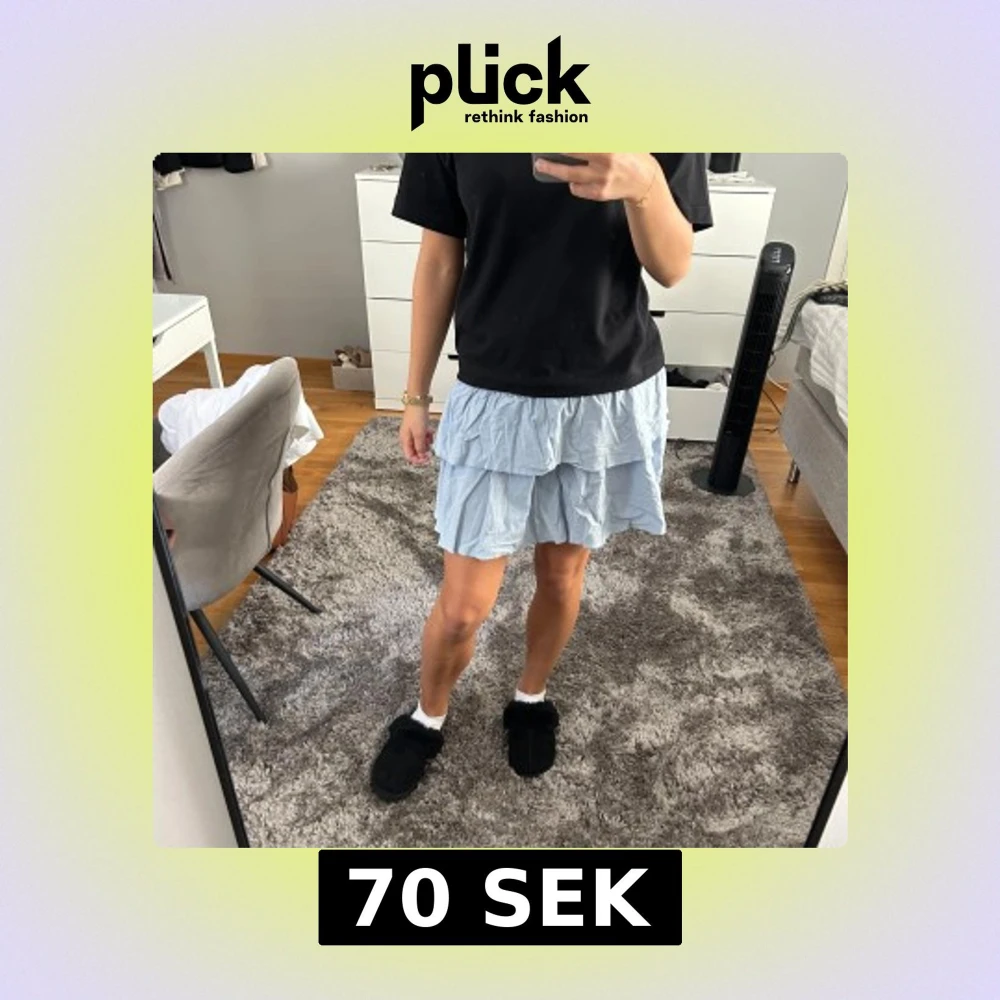 Supersöt ljusblå kortkjol med bred resår i midjan och dubbla volanger. Kjolen är från Shein och är i storlek S. Den har inte fläckar och är knappt använd.☺️🩷