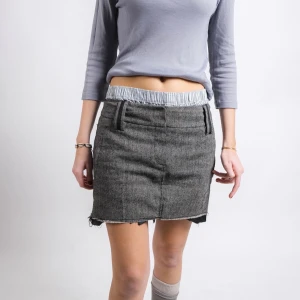 En grå kort kjol i kostym material. Kjolen är omdesignad från ett par kostymbyxor till en kjol vilket gör den unik. Modellen på bilden är 165 och bär normalt stl S men passar väl till både större och mindre beroende på önskad passform. Storlek: S