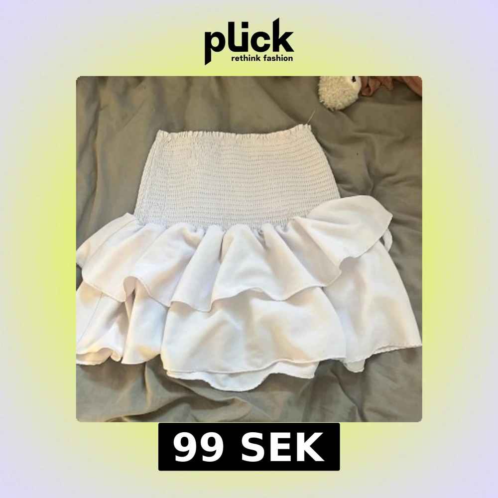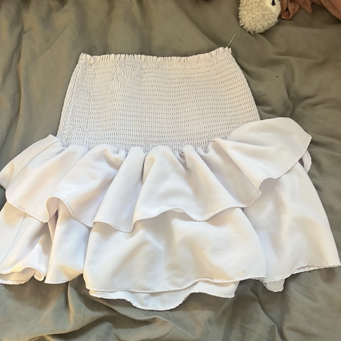 Supersöt vit kortkjol med bred smock i midjan och dubbla volanger nertill. Kjolen har en luftig och flowy känsla, perfekt för varma dagar. Passar dig som gillar romantisk och feminin stil.