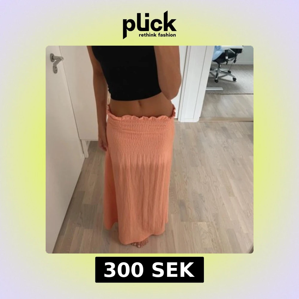 Säljer en vacker persikofärgad långkjol med elastisk midja och volangdetaljer upptill. Jag är 173 cm!!! Passar Xs-M