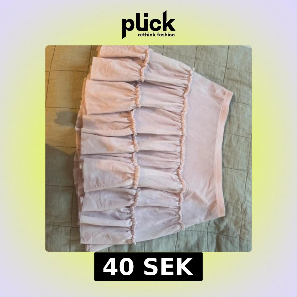 Supersöt ljusrosa kortkjol med flera lager volanger och rynkade detaljer.