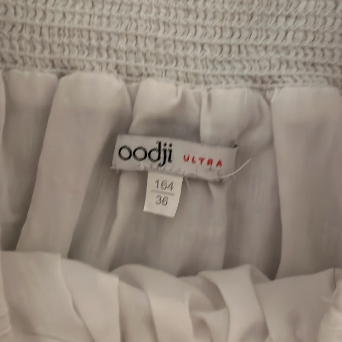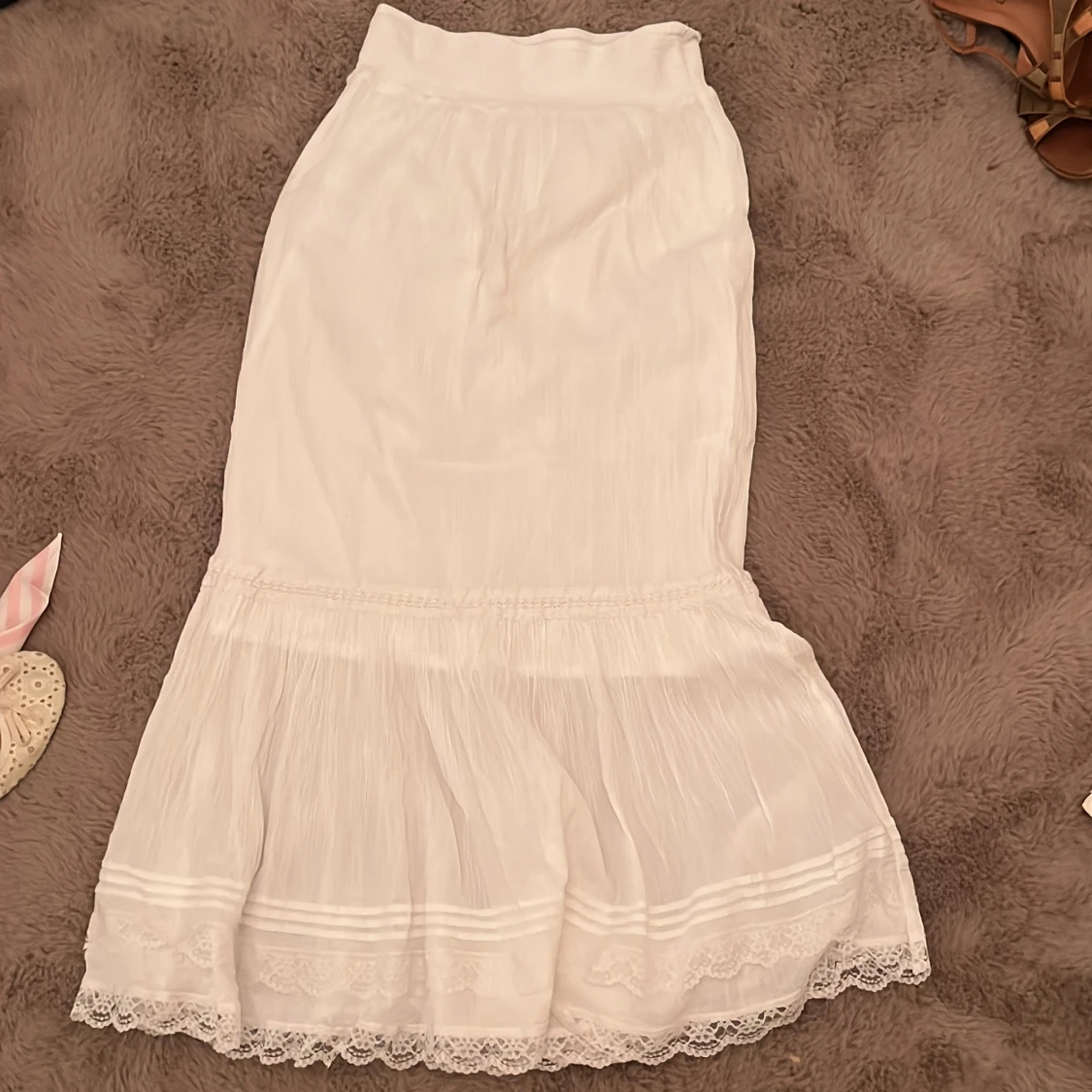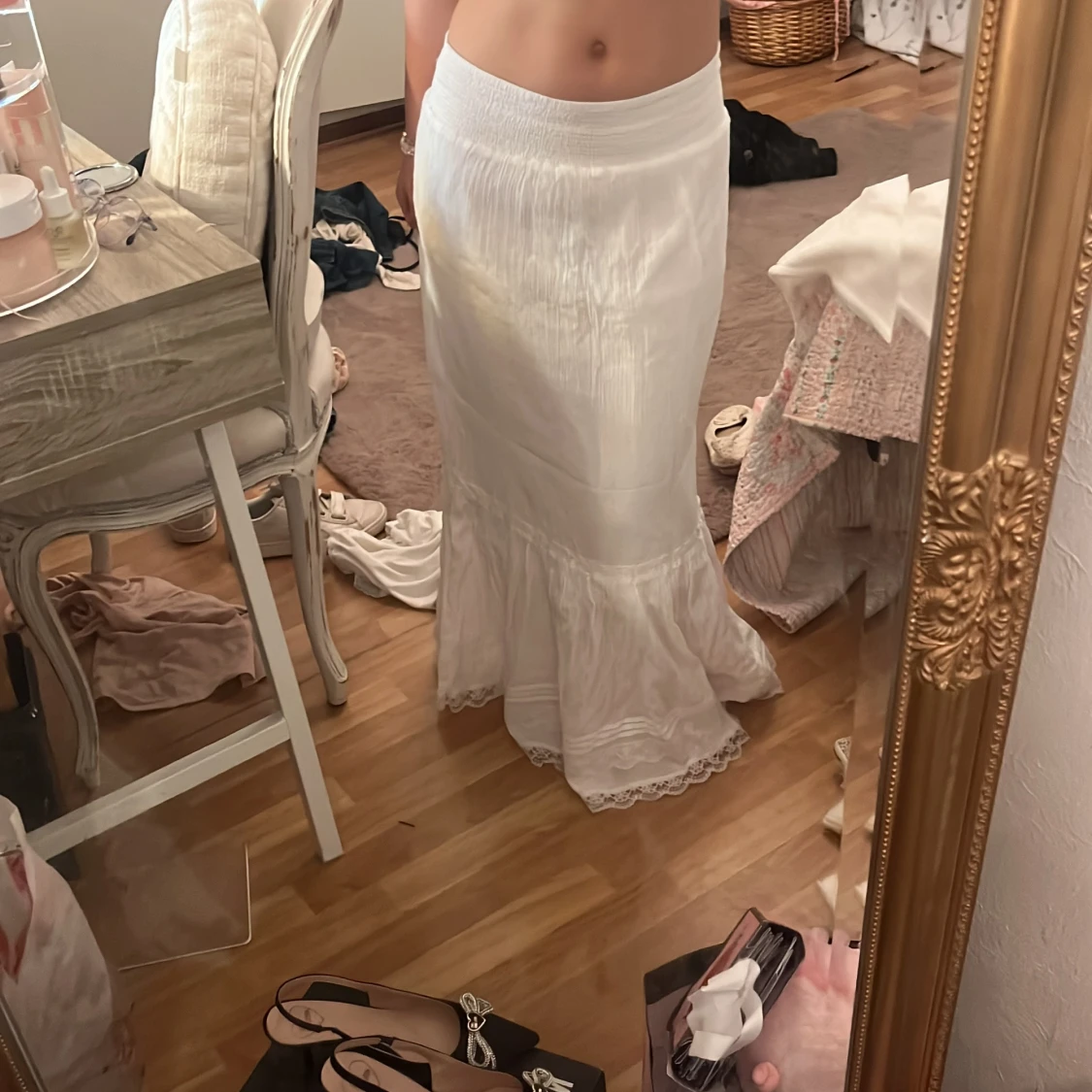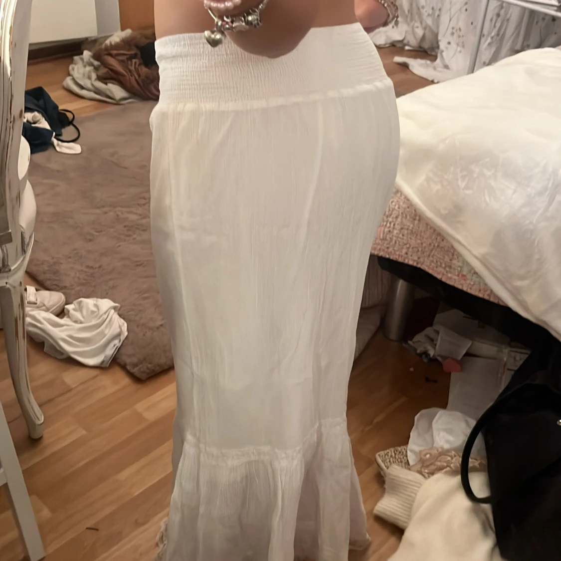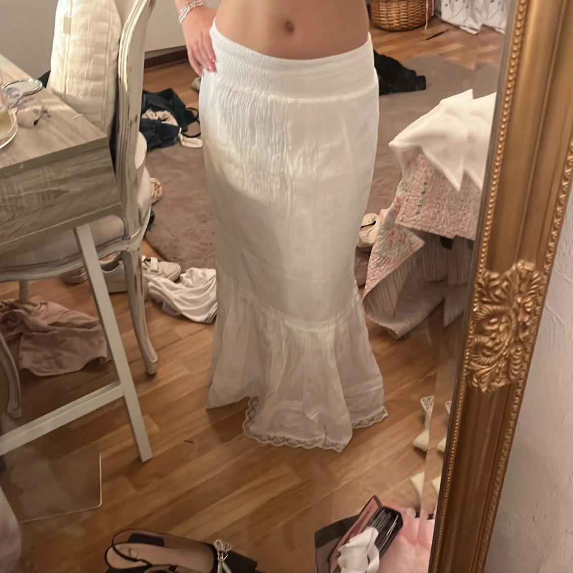 Supersöt vit långkjol med volang nertill och dekorativ spetskant. Kjolen har en smockad midja som gör den bekväm och sitter snyggt. Materialet är tunt och flowy, perfekt för varma dagar. Passformen är normal och kjolen har en feminin, romantisk vibe.