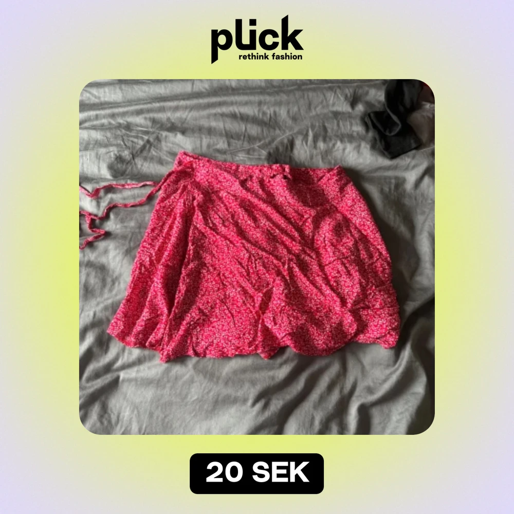 En röd kortkjol med ett blommigt mönster. Kjolen har en omlott-design och knytband i midjan.