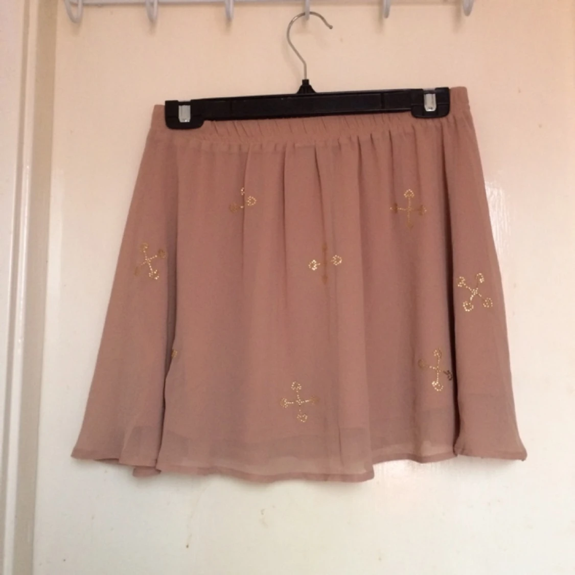 Utställd minikjol. Beige/rosa (färgen är någonstans mittemellan vad de två bilderna visar) med små guldstenar. Strl 38 men passar 36-40. Pris diskuterbart, kan mötas runt Malmö eller skicka på posten.