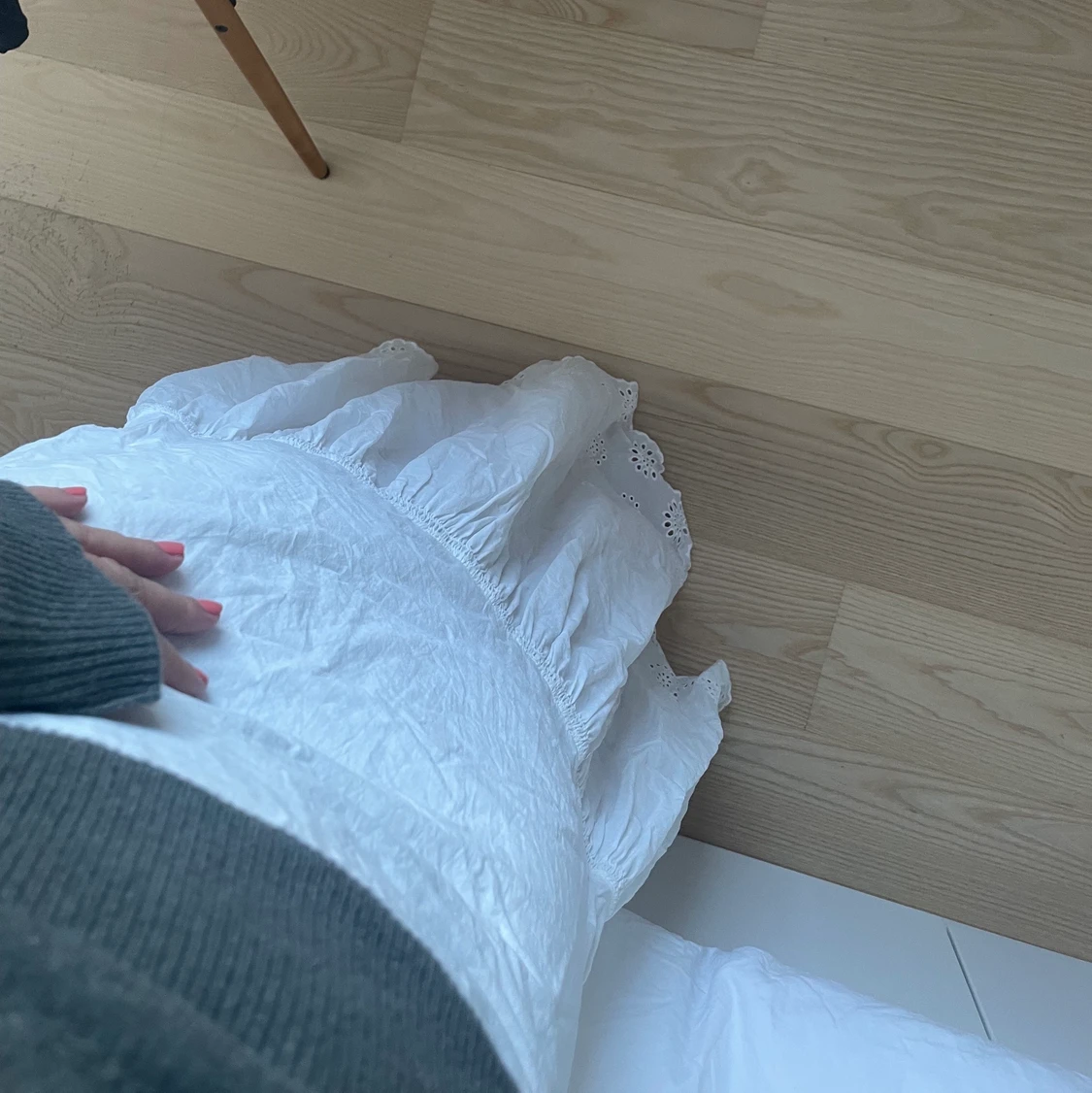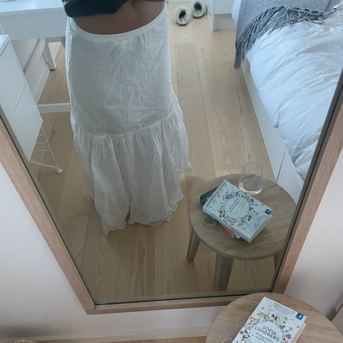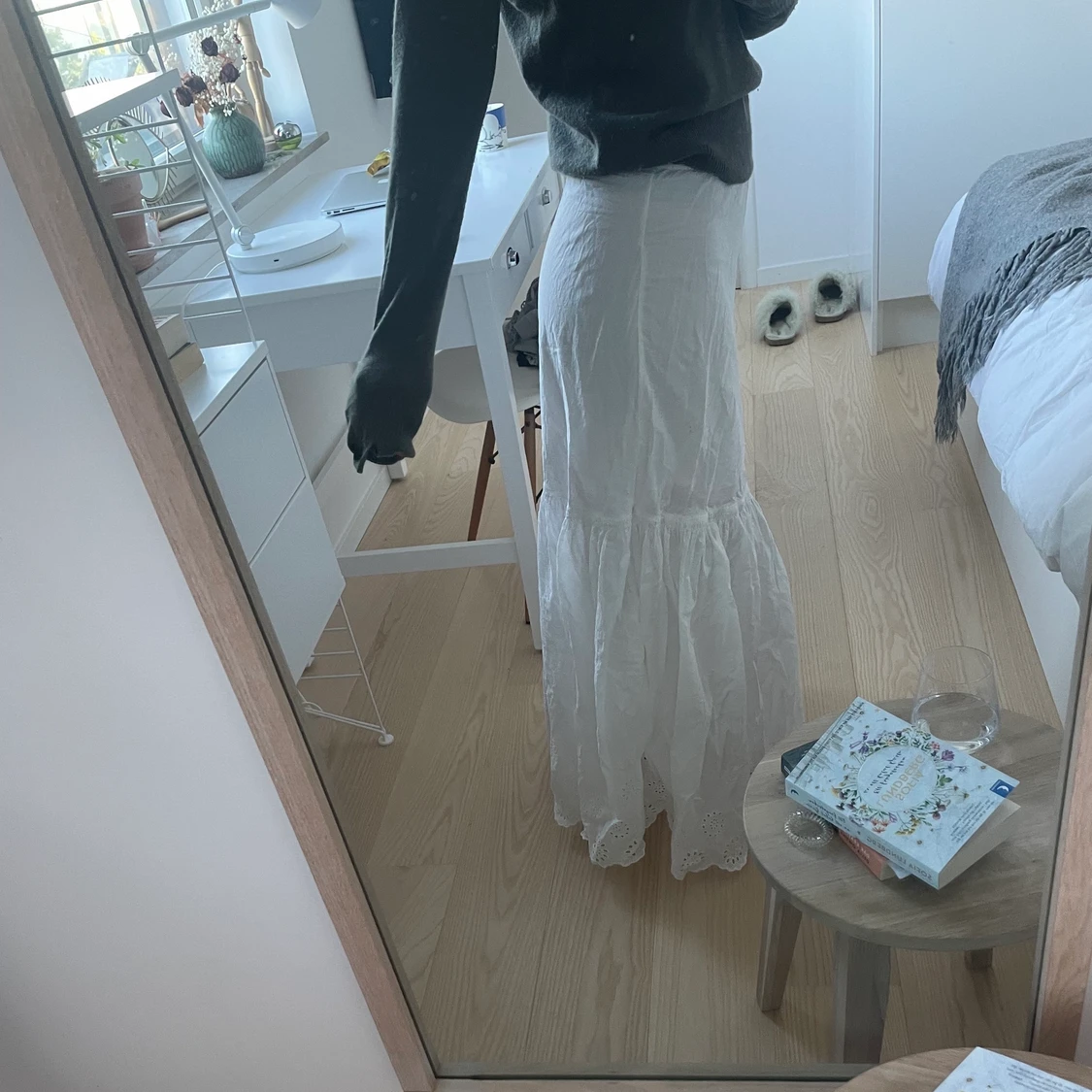 Vit långkjol med lite broderier längst ned. Kjolen är i storlek M men är insydd så mer S. Inte använd en enda gång så helt i nyskick. Frakt på 66 kr tillkommer vid köp😊💓