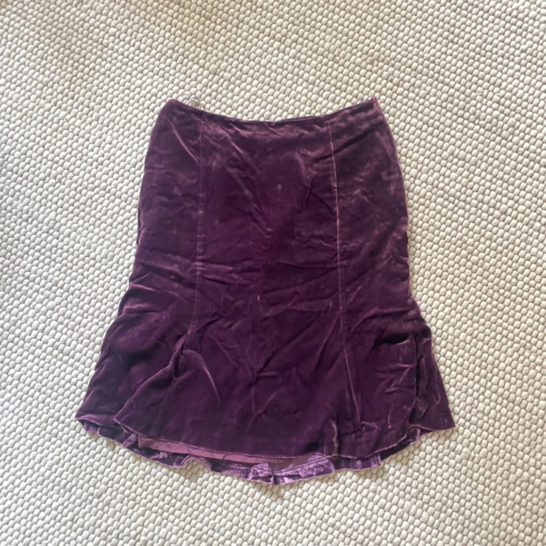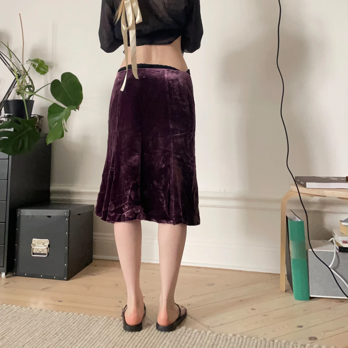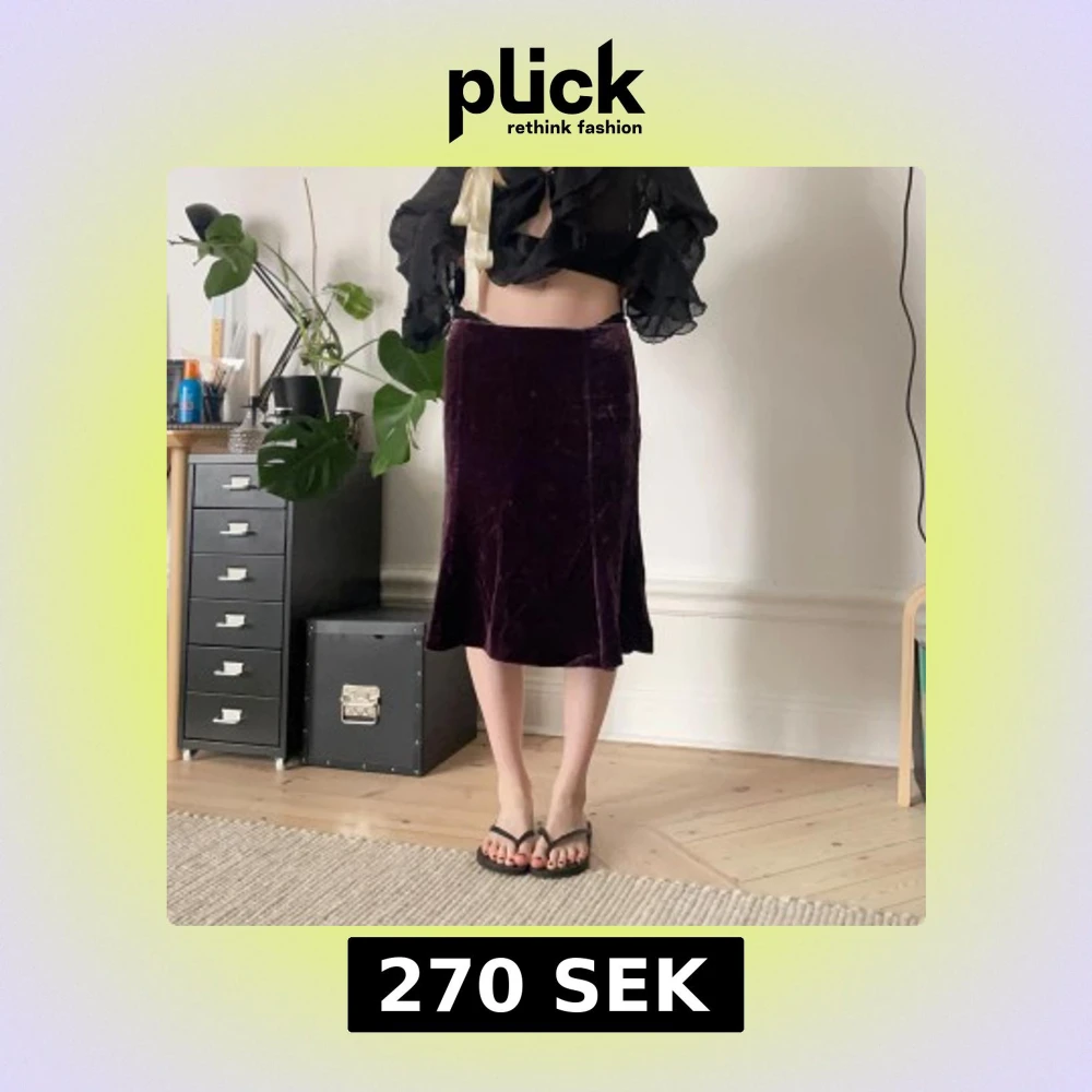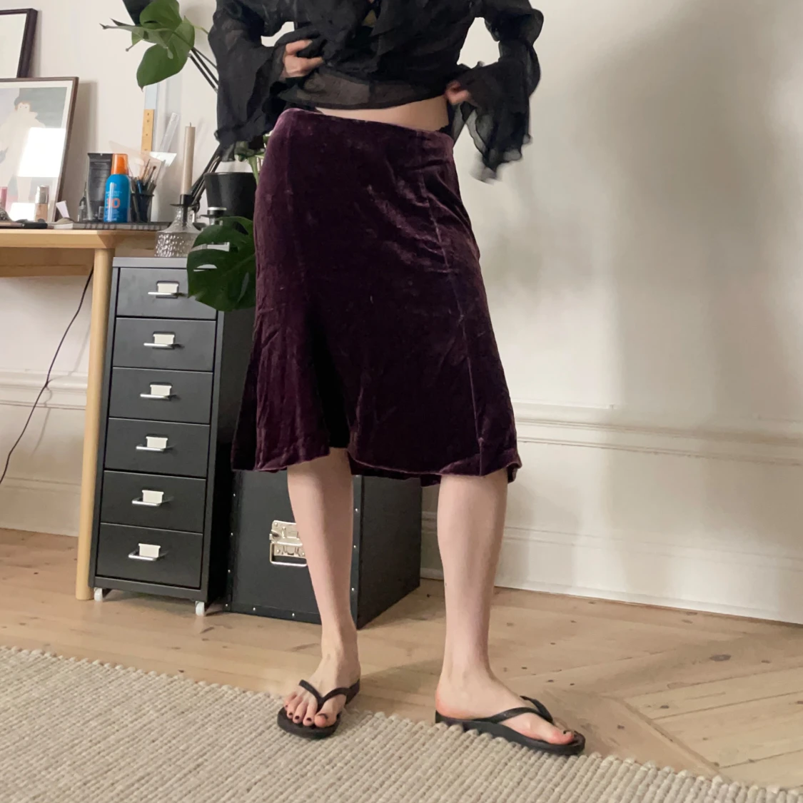 Midikjol i lila sammet som funkar bra både sommar och höst 💕Storlek 36, funkar bra low waist på mig som är 34 🫶🏻 Dragkedja i sidan och lite stretchig 💕