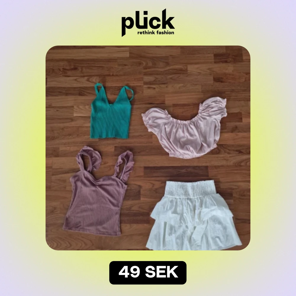 Min syster säljer hennes sommarkläder som hon inte använder. Pris på plaggen är 50:-/st. Mörkrosa linne : Storlek S Vit kjol : Storlek S Gröna linne : Storlek M Ljusrosa blus : Storlek M