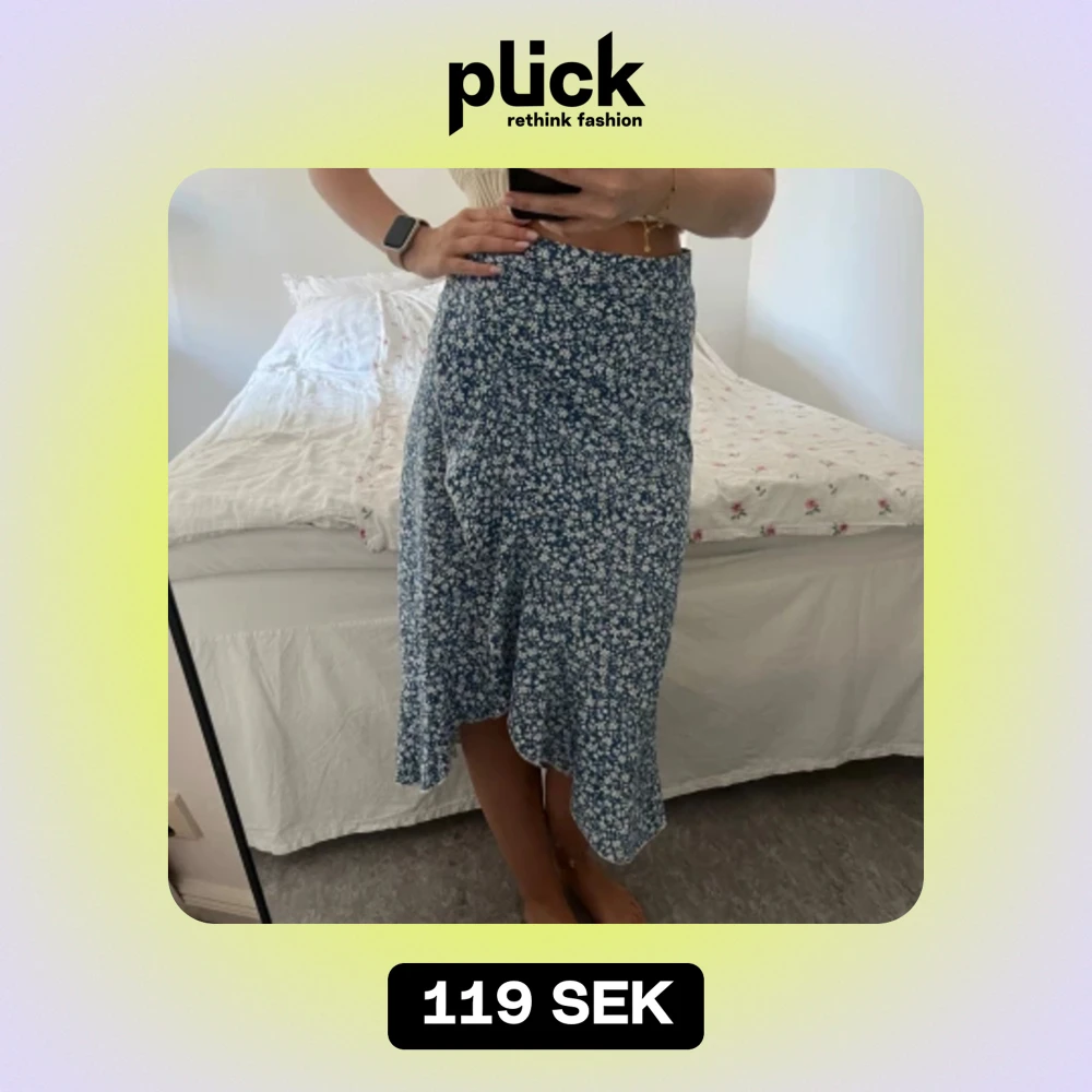 En blå omlottkjol med vita blommor. Kjolen har en asymmetrisk fåll och är knälång.💙✨