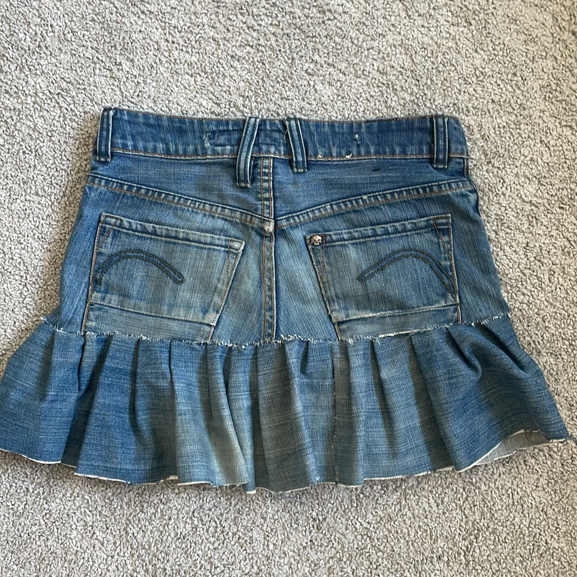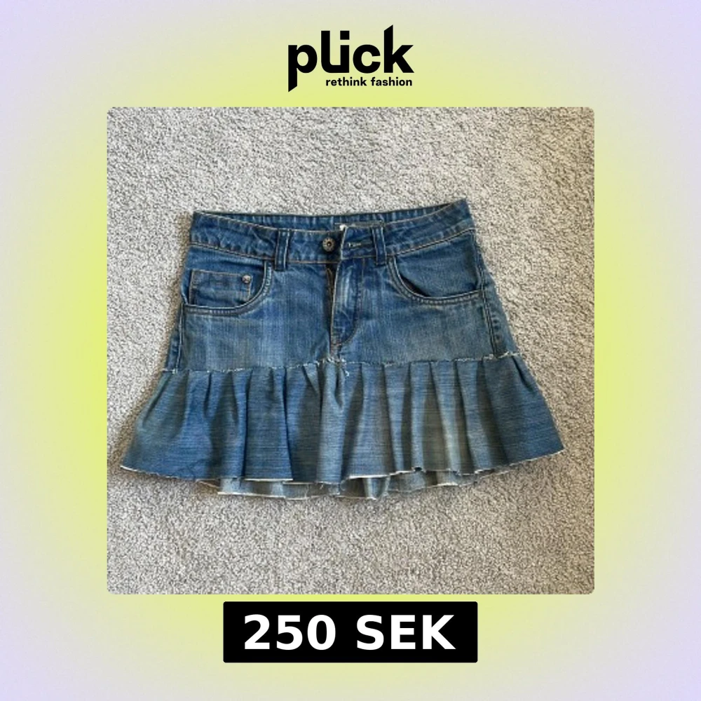 Säljer en blå jeanskjol med volangkant och klassiska fickor både fram och bak. Kjolen har bälteshällor, knapp och dragkedja framtill. Den är kort och har en cool, avslappnad vibe med råa kanter på volangen. Perfekt för dig som gillar denim och vill sticka ut.