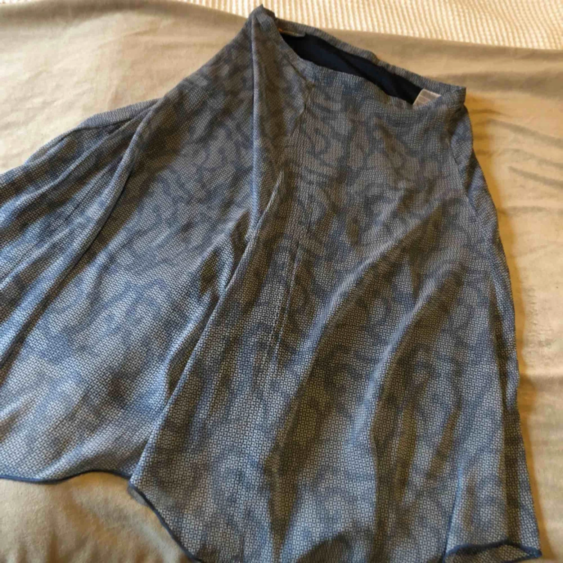 Elegant klassisk kjol som går över knäna. Lätt och luftigt tyg i snygga blå nyanser. Blixtlås i sidan. Storlek S, men passar även M.