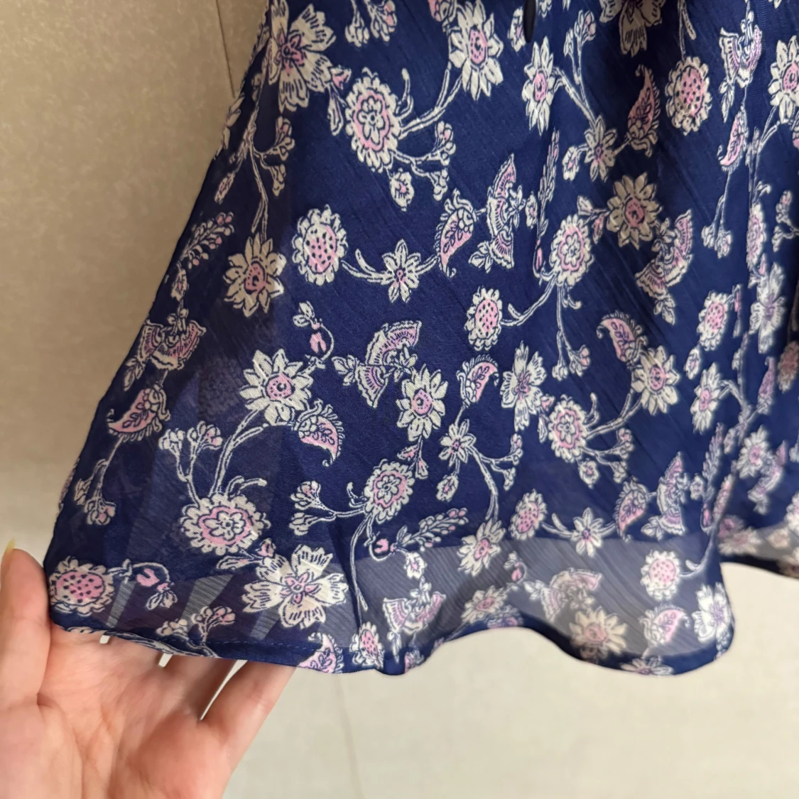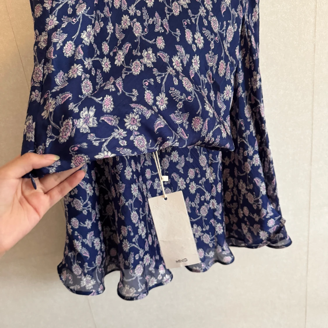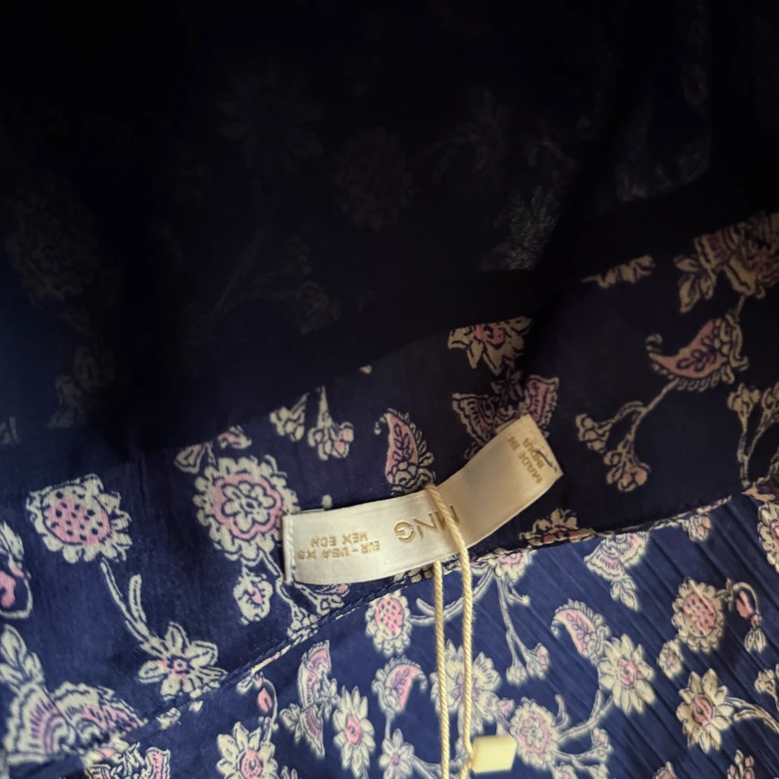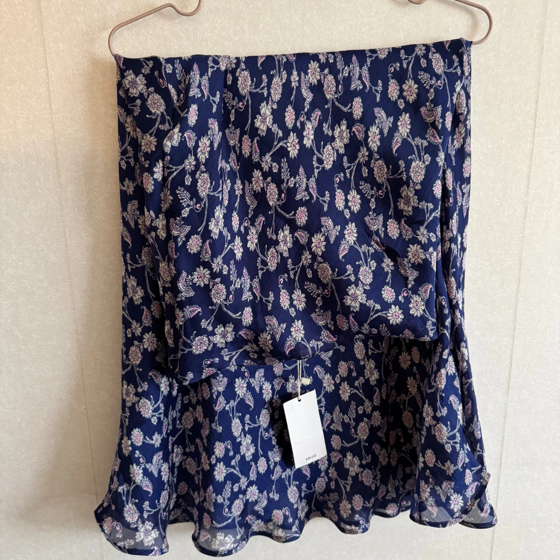Supersöt blå kortkjol från Mango med blommigt mönster i vitt och ljusrosa. Kjolen har volangkant nertill och är gjord i ett lätt, flowy polyestertyg som ger en luftig känsla. Perfekt för dig som gillar romantiska vibes och vill ha något som sticker ut lite extra.