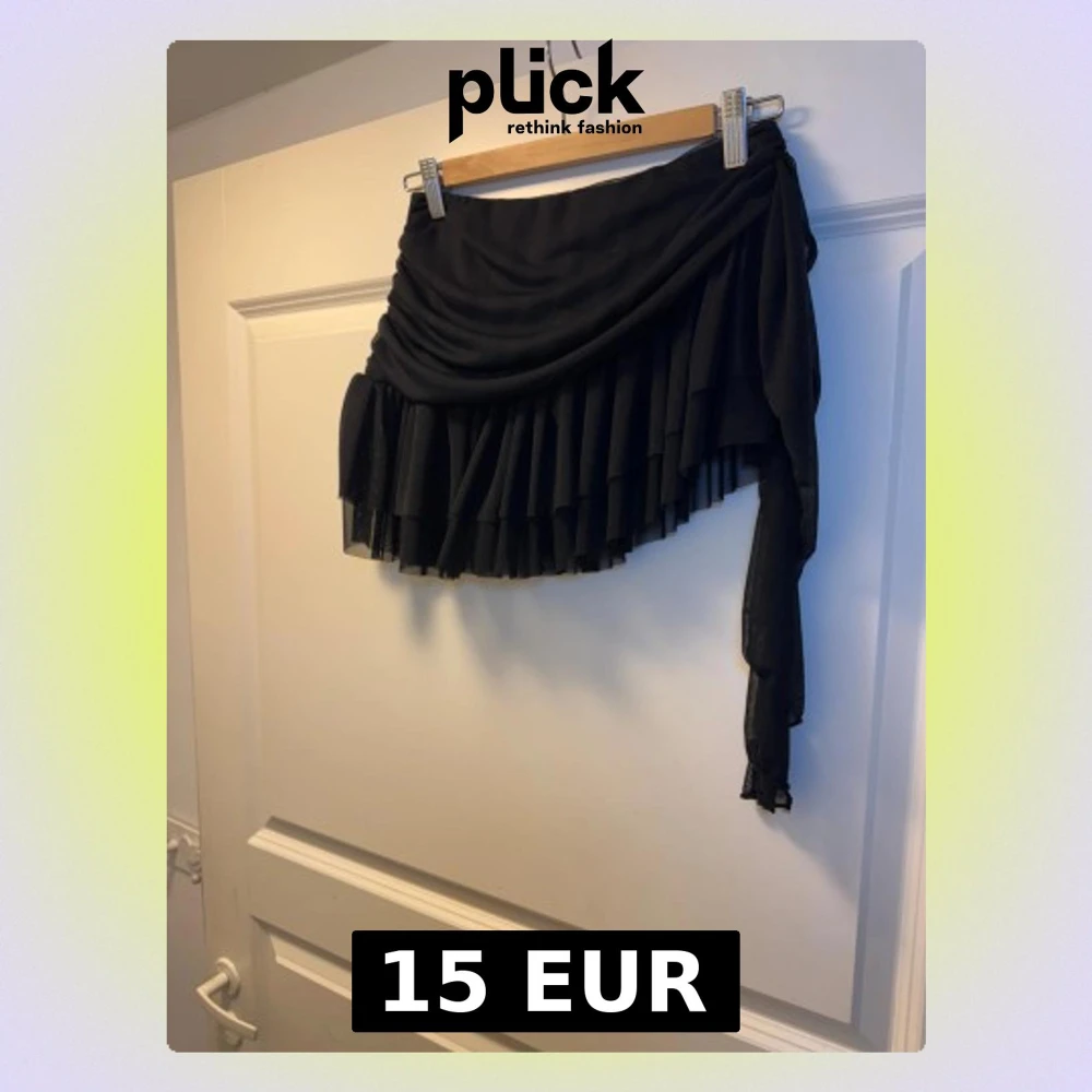 Svart kortkjol med asymmetrisk skärning och volangkant. Kjolen är gjord i tunn mesh med draperad effekt upptill och flera lager plisserade volanger nedtill. Perfekt för dig som gillar en edgy och unik stil.