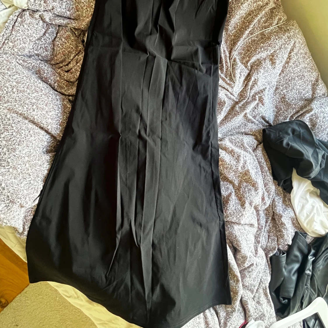 En stilren svart långklänning med rak passform och enkel design. Klänningen är ärmlös och tillverkad i ett slätt polyestertyg som ger en klassisk look. Perfekt för dig som gillar minimalistiska plagg och vill ha något tidlöst i garderoben.