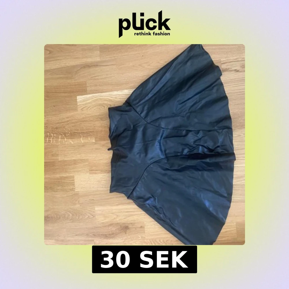 Säljer en svart kjol i skinnimitation med snygg, vid och svängd siluett. Kjolen har en hög midja och är kort i modellen, perfekt för att skapa en cool och edgy look. Materialet ger en glansig finish och känns mjukt mot huden.